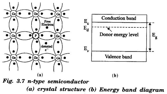When a suitable impurity is added to a pure semiconductor, its electrical conductivity changes. Based on this property, the semiconductors are classified into two types. They are (i) Intrinsic semiconductor or pure semiconductor (ii) Extrinsic semiconductor or impure semiconductor or Doped semiconductor EXTRINSIC OR IMPURE SEMICONDUCTORS In a semiconducting material, if the charge carriers originate from impurity atoms which are doped to the original material, then this type of semiconductor is known as extrinsic or impure semiconductor. It is also known as doped semiconductor. Extrinsic semiconductor is obtained by adding trivalent or pentavalent impurity atoms to a tetravalent semiconductor. The electrical properties of pure semiconductors can be easily changed even with the addition of very little amount of impurities. The addition of impurities to a pure semiconductor is known as doping and added impurity is called as doping agent or dopant. The addition of impurities increases the number of free electrons and holes in semiconductor and hence increases its electrical conductivity. Some of the common doping agents are arsenic, antimony, phosphorus, gallium, aluminium and boron. These elements have either five or three valence electrons in the outermost orbit. • Electrical conductivity is high. • Electrical conductivity can be altered to any desired value by controlling of doping concentration. • Electrical conductivity is not a function of temperature. The extrinsic semiconductors are classified into two types based on the type of impurity added. (Fig 3.6) (i) n - type semiconductor (ii) p - type semiconductor n - type semiconductor When a small amount of pentavalent impurity (group V element) is doped to a pure semiconductor, it becomes n - type semiconductor. Such impurities are known as donor impurities because they donate free electrons to semiconductor crystal. Typical examples of pentavalent impurities are phosphorus, (Atomic No. 15) and antimony (Atomic No. 51). A pentavalent impurity (phosphorus) having five valence electrons is added to a pure semiconductor having four valence electrons (silicon or germanium). Now, four electrons of germanium form a covalent bond with four valence electrons of phosphorus (impurity atom). The fifth electron which is now free finds no place in covalent bond structure as shown in fig. 3.7 (a). We have one electron left free. This acts as a conduction electron. A very small amount of energy (0.01 eV for germanium and 0.05 eV for silicon) is needed to detach this fifth electron. The addition of pentavalent impurity gives a large number of free electrons (negative charges) in semiconductor. Therefore, it is called n - type semiconductor where n stands for negative type. Since every pentavalent atom contributes one free electron, in addition to thermally generated electron-hole pairs, the number of free electrons is more than the number of holes in n-type semiconductor. Thus in this case, electrons are majority charge carriers and holes are minority charge carriers. The energy band diagram of n-type semiconductor is shown in fig.3.7 (b). When the donor impurities are added, the allowable energy levels (donor energy levels) are introduced. These donor energy levels are slightly below the conduction band. They are discrete and do not form a band because the impurity atoms are far away in the crystal and hence their interaction is small. The donor energy level for germanium is 0.01 eV and for silicon it is 0.05 eV below the conduction band. Therefore, even at room temperature, almost all the fifth electrons enter into the conduction band.Types of Semiconductors