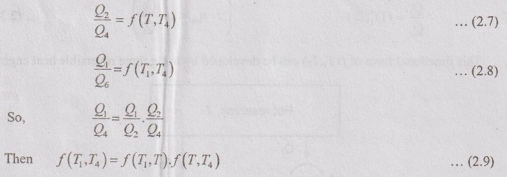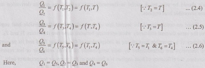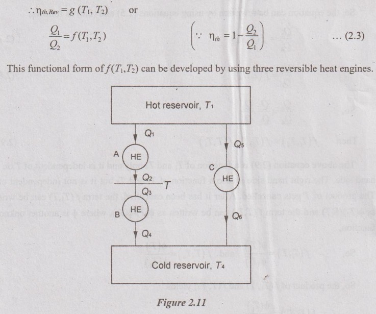 ABSOLUTE THERMODYNAMIC TEMPERATURE SCALE A temperature scale which is independent of the properties of the substances that are used to measure temperature is called a thermodynamic temperature scale. This temperature scale should be very much useful in thermodynamic calculations and its derivation using some reversible heat engines. Based on corollaries of the second law of thermodynamics, all reversible heat engines have the same thermal efficiency when operating between same two reservoirs T1 and T2. The efficiency of a reversible heat engine is independent of the working fluid and its properties. The reservoirs are differentiated by their temperature as a cold reservoir or hot reservoir. Therefore, the efficiency of heat engines is a function of the reservoir temperatures only. Let, the three reversible heat engines A, B and C are arranged as shown in Figure 2.11. Engine A and engine C draw the heat from T1 reservoir. Engine A rejects heat to the engine B. The engine B receives this heat from A and rejects to the low temperature reservoir, T4. But, engine C directly rejects heat to the low
