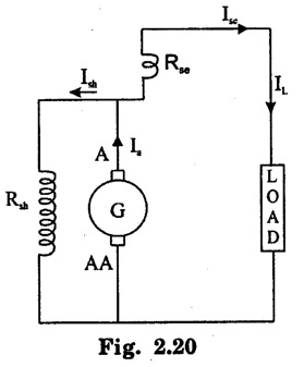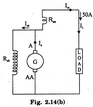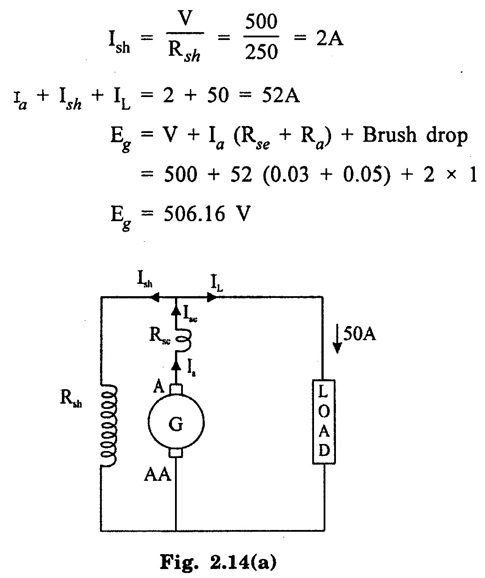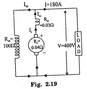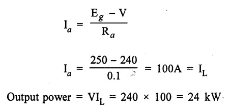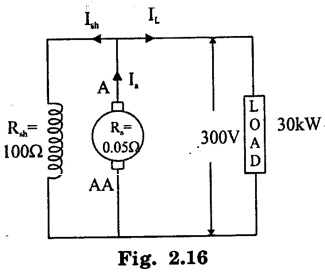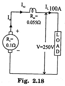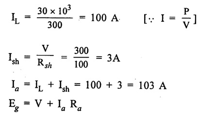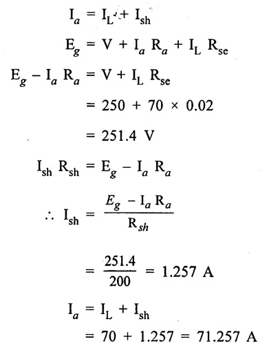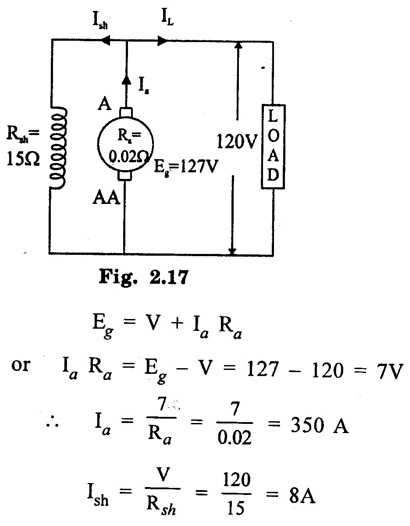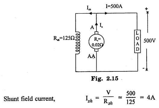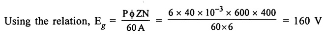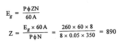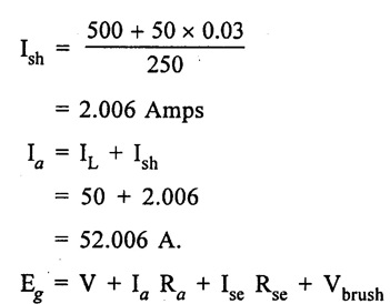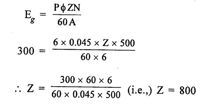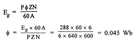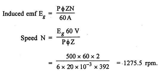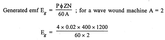 APPLICATIONS OF DC GENERATORS These types of DC generators are generally more expensive than self-excited DC generators because of their requirement of separate excitation source. Because of that their applications are restricted. They are generally used where the use of self-excited generators are unsatisfactory. I. Because of their ability of giving wide range of voltage output, they are generally used for testing purpose in the laboratories. II. Separately excited generators operate in a stable condition with any variation in field excitation. Because of this property they are used as supply source of DC motors, whose speeds are to be controlled for various applications. Example-Ward Leonard Systems of speed control. The application of shunt generators are very much restricted for its dropping voltage characteristic. They are used to supply power to the apparatus situated very close to its position. These type of DC generators generally give constant terminal voltage for small distance operation with the help of field regulators from no load to full load. I. They are used for general lighting. II. They are used to charge battery because they can be made to give constant output voltage. III. They are used for giving the excitation to the alternators. IV. They are also used for small power supply. These types of generators are restricted for the use of power supply because of their increasing terminal voltage characteristic with the increase in load current from no load to full load. We can clearly see this characteristic from the characteristic curve of series wound generator. They give constant electric current in the dropping portion of the characteristic curve. For this property they can be used as constant current source and employed for various applications. I. They are used for supplying field excitation electric current in DC locomotives for regenerative breaking. II. This types of generators are used as boosters to compensate the voltage drop in the feeder in various types of distribution systems such as railway service. III. In series arc lightening this type of generators are mainly used. The compound wound DC generators are most widely used than other types of DC generators, because of its compensating property. I. Cumulative compound wound generators are generally used lighting, power supply purpose and for heavy power services because of their constant voltage property. They are mainly made over compounded. II. Cumulative compound wound generators are also used for driving a motor. III. For small distance operation, such as power supply for hotels, offices, homes and lodges, the flat compounded generators are generally used. IV. The differential compound wound generators, because of their large demagnetization armature reaction, are used for arc welding where huge voltage drop and constant electric current is required. Problem 2.1 A six pole lap wound D.C. generator has 600 conductors, a flux of 40 m.Wb per pole is driven at 400 r.p.m. Find the generated emf. Solution : Number of poles, P = 6 Total number of conductors, Z = 600 Flux per pole, ϕ = 40 m Wb = 40 × 10-3 Wb Speed of rotation, N = 400 r.p.m Number of parallel paths, A = P = 6 [Since the generator is lap wound] Generated e.m.f. Eg: Problem 2.2 A six-pole lap connected generator has a useful flux/pole of 0.045 Wb. If the no load voltage 500 r.p.m. is 300 V, find the conductors on the armature periphery. Solution : Number of poles, P = 6 Useful flux/pole, ϕ = 0.045 Wb No load voltage, Eg = 300 V Number of conductors, Z: Number of parallel paths, A = P = 6 [Since the generator is lap wound] We know that, Hence, total number of armature conductors = 800. Problem 2.3 An 8-pole wave connected D.C. generator has 1000 armature conductors and flux/pole 0.035 Wb. At what speed must it be driven to generate 500 V? Solution : Number of poles P = 8 Total number of armature conductor, Z = 1000 Flux/pole ϕ = 0.035 Wb Generated voltage Eg = 500 V Number of parallel paths, A = 2 [ ⸪ the generator is wave wound] Speed of rotation, N: Using the relation, Hence, speed of generator = 214.3 r.p.m [Ans.] Problem 2.4 An 8-pole, lap wound armature rotated at 350 r.p.m. is required to generate 260 V. The useful flux per pole is 0.05 Wb. If the armature has 120 slots, calculate the number of conductors per slot. Solution : ⸫ Number of conductors / slot = 890/120 = 7.41 This value must be an even number. Hence, conductors/slot = 8 Problem 2.5 The armature of a 6-pole, 600 r.p.m lap-wound generator has 80 slots. If each coil has 4 turns, calculate the flux per pole required to generate an emf of 288 volts. Solution: Each turn has two active conductors and 80 coils are required to fill 80 slots. Z = 80 × 4 x 2 = 640 Problem 2.6 A 4-pole, wave wound generator has 40 slots and 10 conductors are placed per slot. Find, the generated emf when the generator is driven at 1200 rpm and ϕ = 0.02 Wb. Given data : Number of poles P Total number of conductors z = number of slots × conductors per slot z = 40 × 10 = 400 Flux per pole ϕ = 0.02 Wb Speed N = 1200 rpm To find : Generated emf (Eg) Solution: Eg = 320 V [Ans.] Problem 2.7 A compound generator delivers a load current of 50A at 500V. The resistance are Ra 0.05 Ω, Rse = 0.03 Ω and Rsh = 250Ω Find the induced emf if contact drop is 1.0 V per brush. Neglect armature reaction. Assume (a) longshunt, (b) short shunt connection. Solution : Long shunt connection V = 500 V Short shunt connection Now the shunt field current is obtained by dividing (V + IL Rse) by the shunt field resistance = 500 + 52.006 × 0.05 + 50 × 0.03 + 2 Eg = 506.1003 V [Ans.] Problem 2.8 A separately excited generator has induced emf of 250 V and a full load terminal voltage of 240 V. If the value of Ra = 0.1 Ω, find the full load current and output of the generator. Neglect armature reaction and brush drop. Solution: V = 240 V Eg = 250 V Eg = V + Ia Ra P = 24 kW [Ans.] Problem 2.9 A 6 pole, wave wound armature has 4