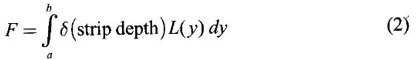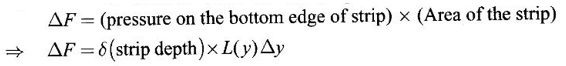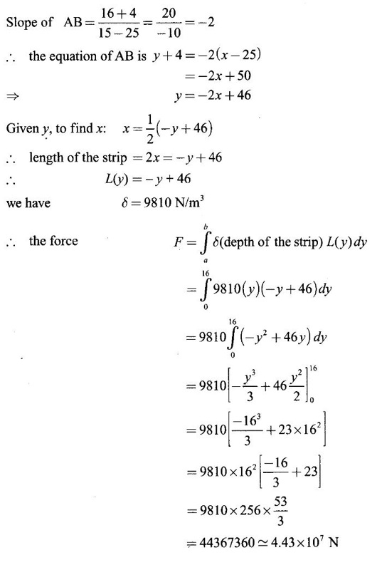 APPLICATIONS OF INTEGRAL We can use definite integral to compute force exerted by a liquid on a surface, such as the force of water on a dam. Dams are built thicker at the bottom than at the top because the pressure against them increases with depth. We need to find the force from the pressure. The pressure in a liquid is defined as the force per unit area exerted on a small piece of area in the liquid. There are two important facts about pressure (i) At any point in a liquid the pressure is same in all directions (i.e. up, down, side ways). So, a diver feels the same pressure on nose and both cars. (ii) Pressure increases with depth. This is one of the reasons why deep sea divers take extra precautions. In general, pressure P is proportional to depth d. ⸫ P = kd Definition 4.5.1 If a force of magnitude F is applied to a surface of area A, then the pressure P exerted by the force on the surface is Weight density of fresh water is δ = 62.4 lb/ft3. i.e., pounds per cubic foot in B.E system. But δ = 9810 N/m3, i.e., newtons per cubic meter in SI system. Suppose a thin horizontal plate with area A and density ρ is submerged in a fluid at a depth d below the surface. Then the fluid above the plate has volume V = Ad and its mass m = ρV = ρAd. The force exerted on the plate is F = mg =ρ gAd where g is the acceleration due to gravity This formula gives the hydrostatic force (i.e., the force exerted by a fluid at rest) against a vertical plate or wall or dam. Example Find the fluid force or hydrostatic force at the bottom of a rectangular swimming pool of size 10 ft x 20 ft containing water to a depth of 3 feet. Solution Force is given by F = δ dA Here δ = 62.4 lb/ft3, d = 3ft, A = 10 × 20 = 200 ft2 ⸫ F = (62.4 lb/ft3) × 3 ft × 200 ft2 ⇒ F = 37,440 lb 1. Integral formula for hydrostatic force against a vertical flat plate Suppose a flat plate is submerged vertically in a fluid. Pressure in the plate varies with depth. So we divide the plate into horizontal strips which may be approximately rectangles of small width so that the pressure is constant on each one. By formula (2) we find the Riemann sum for total force. Taking limit of Riemann sum we get the integral for F. Assume that the flat plate is the region in the vertical xy-plane extending from y = a to y = b. Consider a typical strip of length L(y), width Δy. Thus the element force of the strip is Forming Riemann sum and taking limit we get, Example 1 The face of a dam is a vertical rectangle of height 100 ft and width 200 ft. Find the fluid force or hydrostatic force on the face when the water surface is in level with the top of the dam. Solution Introduce the coordinate system with the left top corner as the origin and axes as shown in figure. Take a strip at a depth y depth of the strip = y L(y) = 200, δ = 62.4 = 62,400,000 lb Example 2 A flat isosceles right triangular plate with base 6 ft and height 3 ft is submerged vertically with base up and 2 ft below the surface of a swimming pool. Find the force exerted by water against one side of the plate. Solution Given an isosceles right triangle is immersed vertically in a swimming pool as in figure. Introduce the coordinate system with vertex O as the origin and the axes as in figure. Example 3 A dam had the shape of the trapezoid as in fig. the height is 20 m and width is 50 m at the top and 30 m at the bottom. Find the force on the dam due to hydrostatic pressure if the water level 4 m from the top of the dam. Solution Given the shape of a dam is a trapezoid as in figure. Introduce a coordinate system. Choose the mid point of the surface of water as the origin and water level at the x-axis and the y-axis down ward as in figure. Choose a strip parallel to the x-axis at a depth y. Here the unit of measure is meter. To find Equation of AB: Example 4 Calculate the fluid force on one side of a semicircular plate of radius 5 ft that rests vertically on its diameter at the bottom of a pool filled with water to a depth of 6 ft. Solution Given a semi circular plate of radius 5 ft is immersed in a pool with the diameter at the bottom of the pool. Choose a coordinate system with the centre as origin and the bounding diameter as the x-axis and the perpendicular radius as the y-axis as in figure. Take a strip at a height y so that the depth of the strip is 6 - y. Equation of circle is x2 + y2 = 25 Example 5 Find the hydrostatic force on one end of a cylindrical drum with radius 3 ft. If the drum is submerged in water 10 ft deep. [Given δ = 62.5 lb/ft3] Solution Given cylindrical drum with radius 3 ft is immersed in water 10 ft deep. Choose the centre of the circular face as the origin and the x-axis horizontal, y-axis vertical as in figure. Equation of the circle is x2 + y2 = 9. ⸫ Take a strip parallel to the x-axis at a distance y from O. ⸫ The depth of the strip = 7 - y Example 6 A flat rectangular plate of size 4 × 2 ft is just immersed in water with the long side horizontal. Find the fluid force against the surface of the plate. Solution Given a rectangular plate is just immersed in water with the long side horizontal. Introduce the coordinate system with left top corner of the plate as origin O and the edges as axes as in figure. Take a typical strip parallel to the x-axis at a depth y ft. Length of the strip L(y) = 4. Density δ = 62.4 lb/ft3 Example 7 A circular plate of radius 8 m is immersed in water at a depth of 4 m from the surface of water. Find the hydrostatic force on the surface of the plate [Take δ = 9800 N/m3] Solution Given a circular plate is immersed in water. Introduce a coordinate system choosing the centre of the circle as the origin O and the horizontal radius as the x-axis and y-axis perpendicular to it. The equation of the circle is Take the typical horizontal strip at a distance y from the x-axis. Then the depth of the strip = (12 - y) m Example 8 A trapezoidal plate 3 ft in height is immersed vertically in water partially with 2 ft inside water. T