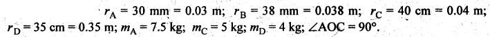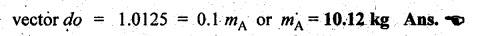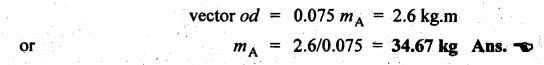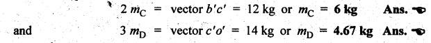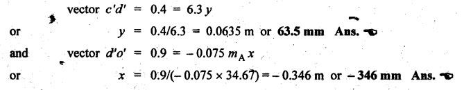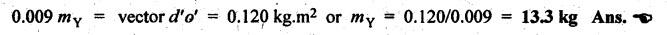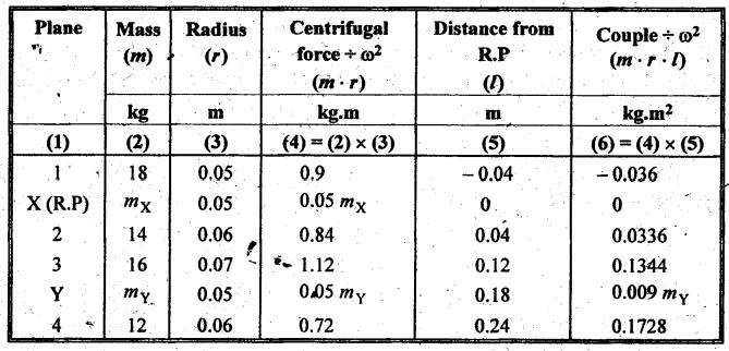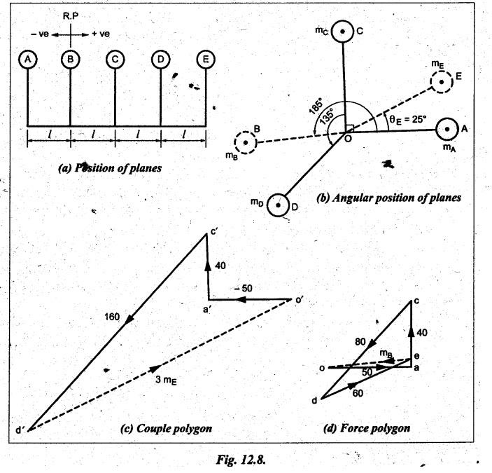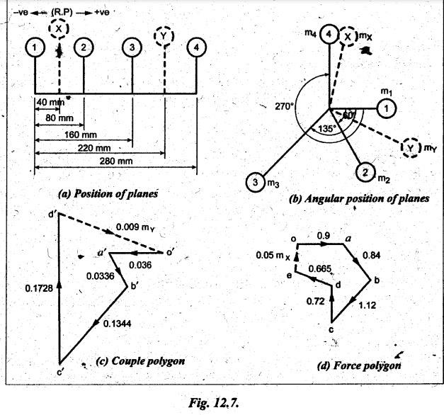 BALANCING OF SEVERAL MASSES ROTATING IN DIFFERENT PLANES [DALBY'S METHOD] The technique of tackling this problem is to transfer the centrifugal force acting in each plane to a single parallel plane which is usually termed as reference plane (R.P.). Then the procedure for balancing is almost the same as for different forces acting in the same plane. The transference of a force from one plane to another plane is explained as given below. Consider a force F acts radially outward in plane A and it is intended to transfer this force to another parallel plane (B) called reference plane which is situated at a distance of 'l' from the plane A, as shown in Fig.12.5. Now introduce two equal and opposite forces F1 and F2, both being parallel to force F, in the reference plane. The equilibrium of the system does not change due to the introduction of forces F1 and F2. The net effect would be a single force F1 in the reference plane having the direction of the original force F along with a couple of magnitude F × l formed by the forces F and F2. Thus the effect of transferring a force F acting in one plane to another plane (reference plane) is equivalent to transfer of the same force F in magnitude and direction in thẹ reference plane accompanied by a couple of magnitude F • l. In order to have the complete balance of the several rotating masses in different planes, the following two conditions must be satisfied. 1. The resultant centrifugal force must be zero, and 2. The resultant couple (ie., the couple about the reference plane) must be zero. Let us consider any number of masses (say, four masses m1, m2, m3 and m4 revolving in planes A, B, C and D respectively, as shown in Fig.12.6(a). The relative angular positions of various masses are shown in the side view [Fig.12.6(b)]. Let mX and mY be the balancing masses to be introduced in planes X and Y respectively. Procedure of Balancing 1. Take any one of the planes, say X, as this reference plane are taken with the reference plane (R.P.). Distances to the left of this reference plane are taken with negative sign and those to right with positive sign. 2. Tabulate the forces and couples as shown in Table 12.1. It may be noted that the planes (in column (1)) are tabulated in the same order which they occurs from left to right (in Fig.12.6(a)). Table 12.1. Note Centrifugal force and couple are to be taken proportional to m r and m r l respectively as ω2 is common to both. 3. The next step is to draw the couple polygon. Couple mA rA lA is negative with respect to the reference plane. So the couple (- mA rA lA) is drawn radially inwards as it is in the reverse direction of OmA. Couple mB rB lB is positive with respect to reference plane, so the couple is drawn radially outwards i.e., in the direction of OmB. Similarly, couples mC rC lC and mD lD are drawn to scale and in the directions of OmC and OmƊ respectively. Couple mY rY lY is the closing side, as shown in Fig.12.6(c). From this expression, the value of the balancing mass mY in the plane Y can be determined. The angle of this mass (θY) can be measured from Fig.12.6(b). 4. Now draw the force polygon from the data given in Table 12.1 column (4), as shown in Fig.12.6(d). The vector eo represents the balanced force. Since the balanced force is proportional to mX rX therefore, From the above expression, the value of the balancing mass mX in the plane X can be obtained. The angle of inclination (θX) of this mass with the horizontal can be measured from the Fig. 12.6(b). • It may be noted here that the couple polygon is drawn first. This is because in Table 12.1, in centrifugal force column (4), we have two unknowns mX and mY, so force cannot be constructed first. But in Table 12.1, in couple column (6), we have only one unknown in terms of mY, so the couple polygon has to be drawn first to obtain the magnitude and direction of mY. Example 12.2 A rotating shaft carries four unbalanced masses 18 kg, 14 kg, 16 kg and 12 kg at radii 5 cm, 6 cm, 7 cm and 6 cm respectively. The 2nd, 3rd and 4th masses revolve in planes 8 cm, 16 cm and 28 cm respectively measured from the plane of the first mass and are angularly located at 60%, 135° and 270° respectively measured clockwise from the first mass looking from this mass end of the shaft. The shaft is dynamically balanced by two masses, both located at 5 cm radii and revolving in planes mid-way between those of 1 and 2 masses and mid-way between those of 3rd and 4th masses. Determine graphically or otherwise, the magnitudes of the masses and their respective angular positions. Given data: m1 = 18 kg; r1 = 5 cm; θ1 = 0° (assuming m1 lies horizontally); m2 = 14 kg; r2 = 6 cm; θ2 = 60°. m3 = 16 kg; r3 = 7 cm; θ3 = 135°; m4 = 12 kg; r4 = 6 cm; θ4 = 270° Solution: Let us consider the two balancing masses are mX and mY in planes X and Y respectively. The position of the planes and angular positions of masses are shown in Fig.12.7(a) and (b) respectively. Here the position of mass m1 is assumed to be in horizontal direction. Since mX and mY are to be found, we can take either plane X or plane Y as reference plane. Taking plane X as the reference plane, and considering the distances of the right of this plane as positive while to the left as negative, the various data may be tabulated as shown in Table 12.2. Table 12.2. Procedure: 1. First of all, draw the couple polygon from the data given in column (6) of Table 12.2, as shown in Fig.12.7(c) to some suitable scale (say, 1 shown in Fig. 12.7(c) to some suitable scale (say, 1 cm = 0.025 kg.m2). The closing side of the polygon i.e., vector d'o' represents the balancing couple and it is proportional to 0.009 mY. Therefore, by measurement 2. The angular position of mass mY is determined by drawing O mY in Fig.12.7(b), parallel to vector d'o' in the same direction. By measurement, angular position of mass mY is θY = 25 in the clockwise direction from mass 3. Now draw the force polygon from the data given in co