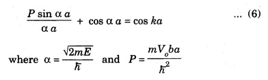BASICS OF KRONIG PENNY MODEL The essential feature of the behaviour of electronic potential is studied by considering a periodic rectangular well structure in one dimension. It was first discussed by Kronig and Penny in the year 1931. The potential energy of an electron, when it moves in one dimensional perfect crystal lattice is assumed in the form of rectangular wells as shown in fig. 7.21. In region where 0 < x < a, the potential energy is zero and in the region – b < x < 0, the potential energy is V0. The one dimensional Schrodinger wave equations for two regions are written as For both the regions, the appropriate solution suggested by Bloch is of the form Differentiating equation (5) and substituting in equations (2) and (4), then further solving it under boundary conditions, we get The term P is called as Scattering power of the potential barrier. It is a measure of strength with which the electrons are attracted by the positive ions. From the graph, we conclude that 1. The energy spectrum of an electron consists of a large number of allowed and forbidden energy bands. 2. The width of allowed energy band (shaded portion) increases with increase of energy values i.e., increasing the values of α a. This is because the first term of equation 3. In the limit P → ∞ the allowed energy band reduces to one single energy level corresponding to the discrete energy level of an isolated atom. (ie., a → ∞) 4. In the other extreme case, when P → 0 cos α a = cos ka Thus, a = k which corresponds to free electron model. This indicates that the particle is completely free and no energy levels exist. Thus by varying P from 0 to ∞ we find that the completely free electron becomes completely bound. The energy of the electron in the periodic lattice is given by From the above equation as k changes, the corresponding energy (E) also changes. For a free electron, the energy curve is continuous as shown.. by dotted parabola. But for the electron in the periodic lattice, the energy curve is not a continuous paraboła and discontinuity occur at The zone between decreases with increase of α a.