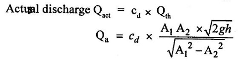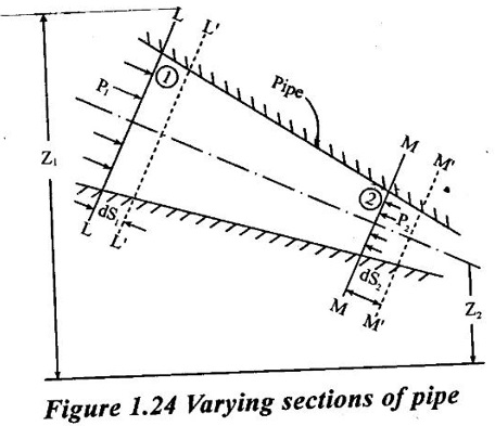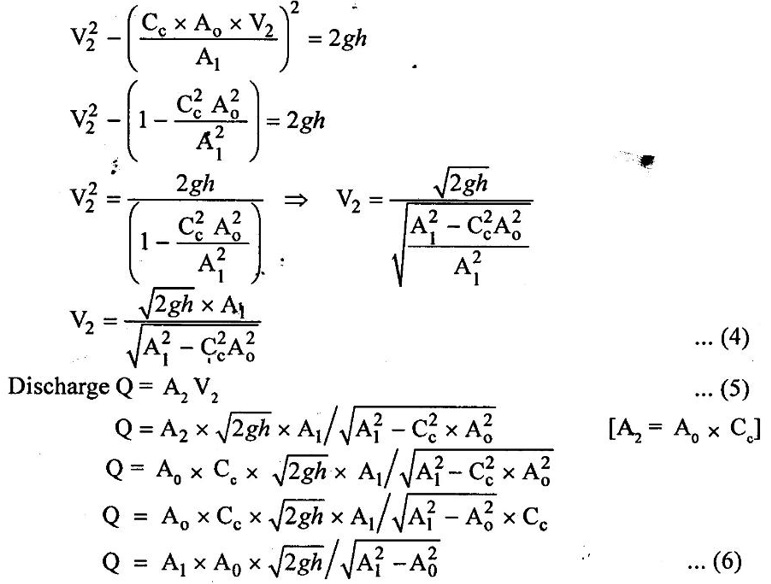 BERNOULLI'S EQUATION FOR IDEAL FLUID It may be stated as hollow in an ideal incompressible fluid. When the flow is steady and continuous, the sum of pressure energy, kinetic energy and potential energy is constant along a substance. Proof ✓ The flow is steady and continuous ✓ The liquid is ideal and incompressible if the velocity is uniform ✓ The velocity is uniform in entire cross sectional area and is equal to mean velocity. ✓ The pressure and gravity forces are only considered, others are neglected ✓ All frictional losses are neglected ✓ The flow is ir-rotational ✓ The ideal, incompressible liquid through a non-uniform pipe ✓ Consider the two sections of pipe L-L and M-M as shown in figure 1.24 and assume that the pipe is running full. There is continuity of flow between the two sections. Here i. The kinetic energy is increased ii. The potential energy is decreased iii. Work done is due to pressure Let, P1 – pressure at L to L section V1 - velocity at L to L section Z1 - height of the axis line from the datum line at L to L section A1 - area of the pipe at L to L section P2, V2, Z2 and A2 – corresponding values at section M to M Let the liquid between the two sections L-L and M-M move to L'L' and M'M' through very small length ds1 and ds2 This movement of both sections of liquid are equivalent to containing liquid of L'L' to MM. Because The sections of L'L' to MM containing liquid is unaffected Mass of fluid entering at LL (m) = density × volume = ρ1 × A1 × dS1 Mass of fluid leaving at MM (m) = density × volume = ρ2 × A2 × dS2 The mass of fluid in both sections are equal as per law of conservation of mass. [For same fluid ρ1 = ρ2] ρ1 × A1 × dS1 = ρ2 × A2 × dS2 Gain of kinetic energy = • m/2 (V22 – V12) loss of potential energy = mg (Z1 - Z2) workdone by pressure at section L-L to L'-L' = pressure force × distance = ρ1 × A1 × dS1 Workdone by pressure at section M-M to M'-M' = ρ2 × A2 × dS2 (-ve sign indicates that direction is P2 is opposite to that of P1) Networkdone by the pressure force = pressure force at section LL to L'L' - pressure force at section MM to M'M' = ρ1 × A1 × dS1 - ρ2 × A2 × dS2 According to continuity equation = A1 × dS1 = A2 × dS2 Principle of conservation of energy, Loss of potential energy + workdone by the pressure force = Gain of kinetic energy mg (Z1 - Z2) + m/ρ (P1 - P2) = m/2 (V22 – V12) divide the above equation by mg on both sides (Z1 - Z2) + (P1 - P2)/ ρ g = (V22 – V12)/2g (Z1 - Z2) + (P1 - P2)/ w = (V22 – V12)/2g (specific weight of liquid w = ρ g) Z1 + P1/w + V12/2g = Z2 + P2/w + V22/2g P/w + V2/2 + Z = constant 1. Velocity of flow across the cross sectional area of the pipe is assumed to be constant but it is not possible in actual practice. 2. The equation has been derived under the assumptions that no external force except gravity and pressure forces are acting on the liquid but in actual practice the force such as pipe friction is acting on the liquid 3. No loss of energy is assumed but during turbulent flow kinetic energy is converted in to heat energy 1. Bernoulli's equation for real fluid: Real fluid has viscosity, so there are some losses occur due to frictional force. These losses should be taken in to account while writing the Bernoulli's equation for real fluid. Z1 + P1/w + V12/2g = Z2 + P2/w + V22/2g + hL Where hL = loss of energy due to friction at inlet and outlet or between two sections considered 2. Bernoulli's equation or energy equation applications 1. Venturimeter 2. Orifice meter 3. Pitot tube 4. Flow nozzle 3. Venturimeter Venturimeter is a device which is used for measuring the rate of change of liquid through a pipe. The basic principle of venturimeter is that by reducing the cross sectional area along the pipe, pressure difference is created and this pressure difference is used for measure the rate of change of flow. Venturimeter works on the basis of principle of Bernoulli's equation. From the figure 1.25 A1, P1 and V1 - area, pressure and velocity at section 1 A2, P2 and V2 – area, pressure and velocity at section 2 Applying Bernoulli's equation for ideal fluid Z1 + P1/w + V12/2g = Z2 + P2/w + V22/2g Both sections height from the datum line or reference line is same hence Z1 = Z2 P1/w + V12/2g = P2/w + V22/2g P1/w - P2/w = V22/2g - V12/2g (P1 - P2)/w = (V22 - V12) /2g ... (1) The pressure head P = specific weight of liquid(w) × height of liquid in u-tube manometer (h) Height of liquid = P/w Apply the h value in equation (1) h = V22/2g - V12/2g ... (2) Continuity equation for ideal fluid: A1V1 = A2V2 V1 = A2V2 / A1 ... (3) Apply equation (3) in equation (2) The above discharge is theoretical. Therefore actual discharge is determined by introducing a constant coefficient of discharge cd. The average value of cd is about 0.98 Coefficient of discharge cd = actual discharge (Qact)/theorecticaldischarge(Qthe) Where A1 -area of the pipe in m2 A2 - area of the throat in m2 Cd - coefficient of discharge no unit h - Height difference of liquid in the u-tube manometer in m 1. Loss of head is small and hence high c, value is obtained. 2. No wear and tear. 3. Loss like hood of becoming clogged with sediments. 4. Suitable for large flow of water, process fluids, wastes, gases and suspended solids. Disadvantages of venturimeter 1. Long laying length. 2. More space requirement. 3. Possibility of cavitations. 4. More expensive in installation and replacement. 1. Using U-tube manometer in horizontal venturimeter Case (1) Specific gravity of measuring liquid in manometer (Sm) is less than specific gravity of flowing liquid (s) S > Sm x - Manometer height difference Sm - Specific gravity of mercury S - Specific gravity of water Case (2) Sm > S 2. Using u-tube manometer in inclined venturimeter Case (1) S > Sm Case (2) Sm > S Using pressure gauge in venturimeter 1. h = P1/w − P2/w Z1 = Z2 in horizontal venturimeter 2. h = P1/w + Z1 – P2/w + Z2 inclined venturimeter An orifice me
