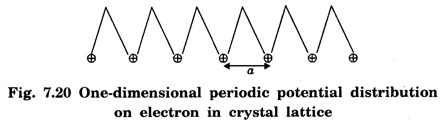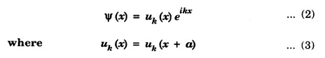 BLOCH'S THEOREM FOR PARTICLES IN A PERIODIC POTENTIAL The motion of electron inside the lattice is not free as expected, but the electron experiences a periodic potential variation. The potential energy on the electron is maximum between adjacent ions and gradually decrease as the electron moves towards ions as shown in fig.7.20. It is a mathematical statement regarding the form of one electron wave function for a perfectly periodic potential. If an electron in a linear lattice of lattice constant 'a' characterised by potential function V(x) = V(x + a) satisfies the Schrodinger equation then the wave functions Ψ(x) of electron (with energy E) is obtained as a solution of Schrodinger equation are of the form Here uk (x) is also periodic with lattice periodicity. The potential V(x) is periodic as V(x) = V(x + a) where a is a lattice constant. From the Block theorem, we can say that the free electron is modulated by the periodic function In other words the solutions are plane waves modulated by the function uk (x) which has the same periodicity as the lattice. This theorem is known as Bloch Theorem. The functions of the type (2) are called Bloch functions. If equation (1) has the solution with the property of equation (2), we can write the property of the Bloch functions i.e., equation (3) as Since uk (x + a) = uk (x), we can write the above equation as If Ψ (x) is a single-valued function, then we can write Ψ(x) = Ψ (x + a) Thus Bloch theorem proved. This equation is similar to that of eqn (2) and eqn (4) i.e., If the potential is a function of 'x' and 'a', then the wave function is also a function of ‘x' and 'a'.Bloch Theorem