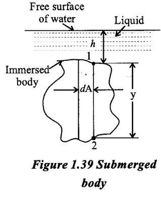 BUOYANCY AND FLOATATION When a body is immersed partially or fully in a fluid it experiences a vertical upward force. This upward vertical force acting on a floating of submerged body is known as buoyancy force. The buoyance force is equal to the weight of the fluid displaced by the body or equal to the loss of weight of the body when it is weighed in the liquid. This buoyance force acts through the centre of gravity of the displaced fluid and this point is called the centre of buoyance. The stability of any floating of submerged body is the tendency of the body when it is slightly disturbed to return to or to go away from its original position. The body in a static equilibrium may or may not retain its original position when its slightly disturbed. The body is stable only or it returns to original position when its centre of stable floating body is slightly tilted lying on the normal axis of the body which is called the meta centre of the body. Archimedes law states that whenever a solid body is immersed Wholly or partly in a liquid it is acted by a force equal to the weight of the liquid displaced by body in the opposite direction of gravitational force of the body. Buoyant force = Loss of weight of the body (or) Weight of the fluid displaced by the body. Consider a body immersed in the liquid as shown in figure 1.39. Consider an elemental cylinder whose cross-sectional after dA and height of y and located of a height h shown the free surface of work. i) Force acting on the elemental cylinder at point 1 F1 = p1 dA F1 = w× h • dA ii) Force acting on the elemental cylinder of point 2 F2 = p2 dA F2 = (w + h) dA iii) Net force acting on the elemental cylinder dF = F2 – F1 = w(h + y) dA wh dA = wh dA + wy dA – wh dA = wy dA = w dỤ (dU = y.dA volume of cylinder) iv) Total force acting on the body (Fb) Fb = ΣwdU = w⋅U Where U is the total volume of the body. This force Fb acting on the body from the down is known as buoyancy force. Anybody existing in the liquid the forces acting on the body are its weight (w) and buoyancy force (Fb). Whether the body sinks of floats depends upon the magnitudes of W and Fb. a) If w > Fb then the body sinks and completely seated in bottom surface of the reservoir. b) If w = Fb then the body floats touting its top to the free surface of water. c) If w < Fb1 then the body floats of partially submerged in a fluid. 1) The float valves for controlling the level of water in overhand storage tanks and cisterns work on the principle of buoyancy. 2) Determining the specific gravity of liquids. The hydrometers are working on the principle of buoyancy. 3) Surfacing and submerging of submarine is achieved by decreasing and increasing the weight of the submarine. Submarine has ballast tanks when these tanks are filled up, submarine goes down in sea water and when water is pumped out from the ballast tanks, the submarine surfaces on the surface. 4) Determining the volume of anybody, the loss of weight of anybody is equal to weight of the displaced volume of liquid. The volume displaced is equal to the volume of the body. 5) Life jacket for ships and rubber rafts for aeroplanes flying over the ocean work on the principle of buoyancy. These develop keep increasing the volume of displaced water.1. Introduction