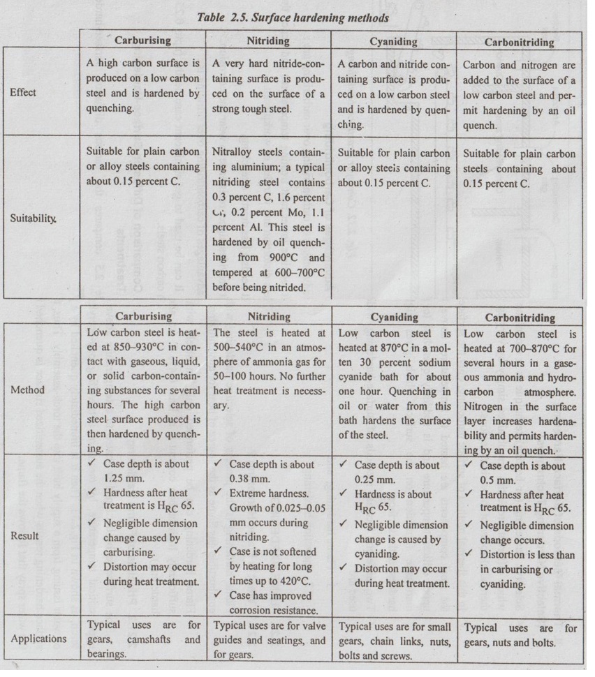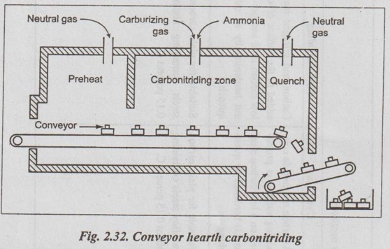 CARBONITRIDING ✓ As we know, in the carburising process the diffusing hardening element is carbon. In nitriding process, the diffusion involves nitrogen. As the name suggests, carbonitriding is a surface- hardening process that involves the diffusion of both nitrogen and carbon into the steel surface. ✓ Carbonitriding is also known as gas-cyaniding or dry- cyaniding, because it makes use of a mixture of hydrocarbons pile and ammonia. (i) Carbonitriding is an ideal process for hardening small components where great resistance to wear is necessary. (ii) The steels that are commonly carbonitrided are the low- carbon and low-carbon alloy steels. The carbonitriding process is carried out in a gas-atmosphere furnace using a carburising gas such as propane or methane mixed with the ammonia. The organic gas serves as the source of carbon and the ammonia gas serves as the source of nitrogen. The workpiece is heated to 850°C in the mixture of above gases for 2 - 10 hours. This is followed by quenching (to increase hardness), and then tempering (to reduce brittleness) is employed at 180°C. Now both carbon and nitrogen diffuse simultaneously, carbon diffuse at higher rate. A typical carbonitriding system is illustrated in Fig.2.32. The advantages of carbonitriding over carburising are: 1. It requires lower heat treating temperatures and hence there is less distortion and warping of workpieces. 2. It needs a less drastic quenching. 3. It provides higher resistance to wear and corrosion. The advantages of carbonitriding over nitriding is: 1. It can be used to get significant case depths (upto 0.25 mm) on plain carbon steels. Table 2.5 compares the various diffusion surface-hardening processes. II. Thermal Methods of Surface-Hardening (Selective Hardening Techniques) ✓ Selective hardening (or heating) technique is a technique by which different properties are obtained simply by varying the thermal histories of the various regions. ✓ In this thermal method of surface hardening, only the surface of the steel components are heated to temperatures above the upper critical temperature and is suddenly quenched to get martensite formation on the surface which gives higher hardness at the surface. ✓ Two different thermal methods of surface-hardening widely used are: 1. Flame hardening, and 2. Induction hardening.1. What is Carbonitriding?