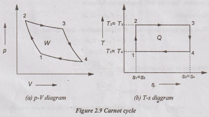 CARNOT CYCLE AND ITS PERFORMANCE It is also called constant temperature cycle. This cycle was introduced by Sadi Carnot. It consists of four processes such as two isentropic or reversible adiabatic and two isothermal processes. p-V and T-s diagrams for Carnot cycle are given in Figure 2.9. Process 1-2: Isentropic compression Air is isentropically compressed from state 1 to state 2. During this process, both pressure and temperature increase from p1 to p2 and T1 to T2 respectively. But, the volume decreases from V1 to V2. There is no heat addition or rejection during this process. Therefore, the entropy remains constant (s1 = s2). Process 2-3: Isothermal heat addition During this process, the heat is supplied to the fluid at constant temperature. Therefore, there is no change in temperature i.e. T3 = T2 but both volume and entropy increase from V2 to V3 and s2 to s3 respectively. Also, the pressure decreases from p2 to p3. Heat supplied, Q1 = T2.ds = T3.ds ⸫ ds = dQ/T and T = T2 = T3 dQ = T.ds Process 3-4: Isentropic expansion Air is isentropically expanded from state 3 to state 4. During this process, both pressure and temperature decrease from p3 to p4 and T3 to T4 respectively. But, the entropy remains constant (s3 = s4). Process 4-1: Isothermal heat rejaction During this process, the heat is isothermally rejected from the fluid and it attains its initial position. Thus, the fluid completes one full cycle. where T1 and T2 are minimum and maximum temperatures respectively. In this cycle, all four processes are reversible. Therefore, it is a reversible cycle. By Carnot theorem, the reversible engine gives the maximum efficiency than any other engine. Thus, the Carnot cycle produces maximum efficiency than any other cycle.