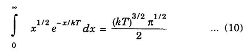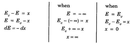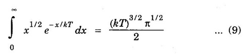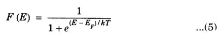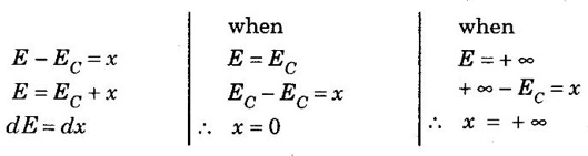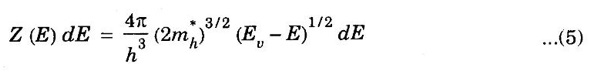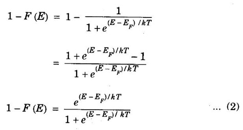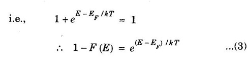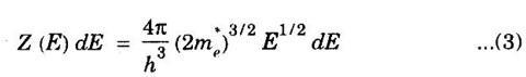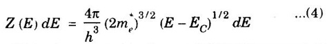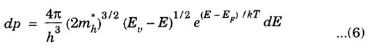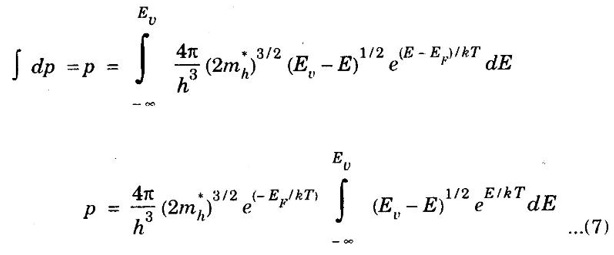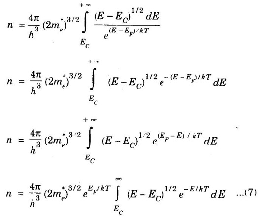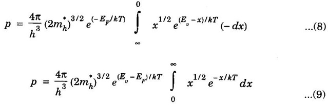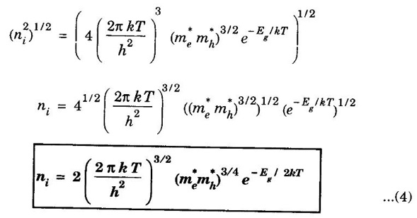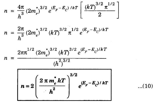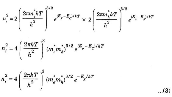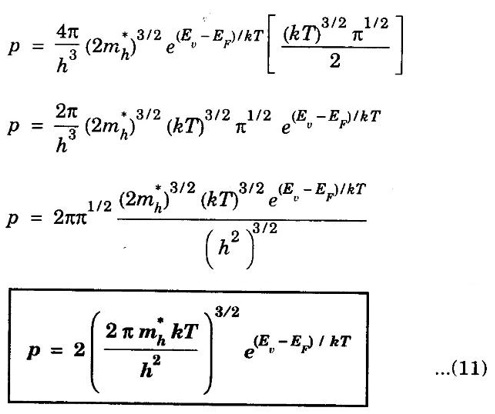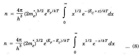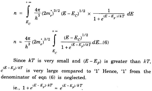 CARRIER CONCENTRATION IN INTRINSIC SEMICONDUCTORS The number of electrons in conduction band per unit volume of the material is called as electron concentration (n). Similarly the number of holes in valence band per unit volume of the material is called hole concentration (p). In general, the number of charge carriers per unit volume of the material is called carrier concentration. It is also known as density of charge carriers. The number of electrons per unit volume in conduction band for energy between E and E + dE is given by dn = Z (E) F (E) dE ...(1) where Z (E) dE - Density of states in energy between E and E + dE F (E) - Probability of electron occupancy. Number of electrons in conduction band for the entire range is calculated by integrating eqn (1) between energy Ec and + ∞. Ec is energy corresponding to the bottom most level and +∞ is energy corresponding to the upper most level in conduction band. (Fig 3.5). Density of states in conduction band between the energy range E and E + dE is given by The bottom edge of the conduction band (EC) denotes the potential energy of an electron at rest. Therefore, (E – EC) is the kinetic energy of conduction electron at higher energy levels. Thus, in eqn (3), E is replaced as (E – EC) The electrons in conduction band are not totally free. They move in a periodic potential of the crystal lattice. Therefore, in eqn (3), the mass of the electron (m) is replaced by its effective mass me* according to band theory of solids. The probability of electron occupation is given by Fermi distribution function Substituting eqns (4) and (5) in (2), we get Now, eqn (6) becomes To evaluate above integral in eqn (7), let us assume Substituting above values in eqn (7), we have Using the gamma function, it is shown that Substituting eqn (9) in eqn (8), we have Equation (10) is the expression for concentration of electrons in the conduction band of intrinsic semiconductor. Density of holes in Valence Band of Intrinsic Semiconductor (Derivation) We know that if an electron is transferred from valence band to conduction band, a hole is created in valence band. Let dp be the number of holes per unit volume in valence band between the energy E and E + dE. dp = Z (E) (1 - F (E)) dE ...(1) where Z (E) dE→ Density of states in the energy range E and E + dE. Since F(E) is the probability of electron occupation 1 - F (E) is the probability of an unoccupied electron state, i.e., probability of presence of hole. Since E is very small when compared to EF, in valenceband, (E - EF) is a negative quantity. Therefore, e (E – EF)/kT is very small and it is neglected in the denominator term of eqn (2). Density of states in valence band, Here, mh* is the effective mass of the hole in valence band. Ev, top of energy level in valence band is the potential energy of a hole at rest. Hence, (Ev - E) is the kinetic energy of the hole at level below Ev. So the term E in eqn (4) is replaced as (Ev - E). Substituting eqns (3) and (5) in (1), we get The number of holes in valence band for the entire energy range is obtained by integrating eqn (6) between limits - ∞ to Ev. To evaluate the integral in eqn (7), let us assume, Substituting these values in eqn (7), we have [-ve sign is omitted by interchanging the limits] Using the gamma function, it is shown that Substituting eqn (10) in eqn (9), we have The equation (11) is the expression for the concentration of holes in valence band of intrinsic semiconductor. In an intrinsic semiconductor, the number of electrons in conduction band is equal to the number of holes in valence band. In general, intrinsic carrier concentration ni is equal to electrons concentration concentration in conduction band (n) or holes concentration in valence band (p). Substituting the expressions of n and p in eqn (2), we have where EC - Ev = Eg is forbidden energy gap. Taking square root on both sides in eqn (3), we have The eqn (4) is expression for intrinsic carrier concentration Intrinsic semiconductors cannot be directly used to fabricate devices due to the following limitations: • Electrical conductivity is low. Germanium has a conductivity of 1.67Ω-1m-1 which is nearly 107 times smaller than that of copper. • Electrical conductivity is a function of temperature and increases exponentially as temperature increases. In intrinsic or pure semiconductors, the carrier concentration of both electrons and holes is very low at normal temperatures. In order to get sufficient current density density through semiconductor, a large electrical field should be applied. This problem is overcome by adding suitable impurities into intrinsic semiconductors.Definition