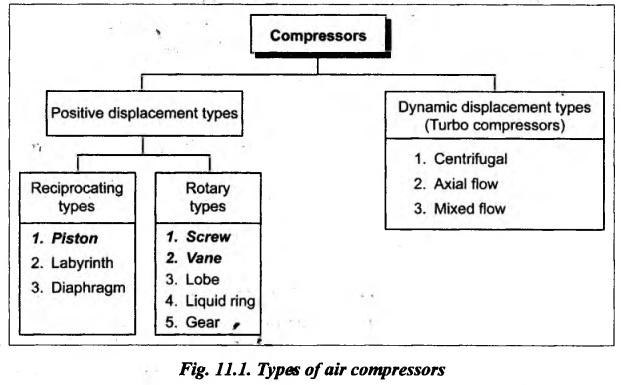 COMPRESSORS • A compressor is a device used to compress air (or any gas) from a low inlet pressure (usually atmospheric pressure) to a higher desired pressure level. • In pneumatic systems, compressors are used to compress and supply the required quantities of air. • As per the laws of perfect gas, the compressor increases the pressure of the air by reducing its volume. • There are two basic types of compressors, based on their method of energy transfer and pressure generation. They are : 1. Positive displacement compressors, and 2. Dynamic type compressors. • Positive displacement compressors work on the principle of increasing the pressure of a definite volume of air by reducing that volume in an enclosed chamber. • Dynamic compressors, also known as turbo compressors, employ rotating vanes or impellers to increase the pressure of the air. • The detailed sub-classification of compressors are presented in Fig.11.1. However, the study of piston-, screw-, and vane-type compressors are more important from our subject point of view.1. What is a Compressor ?