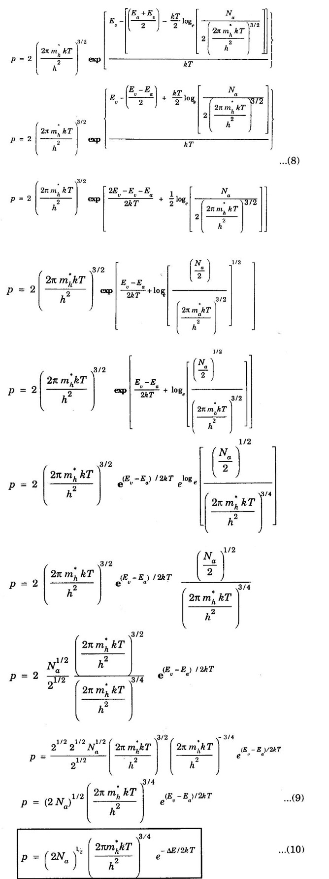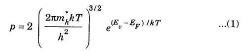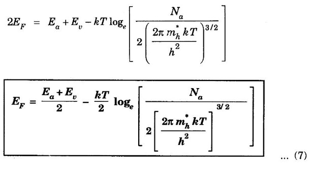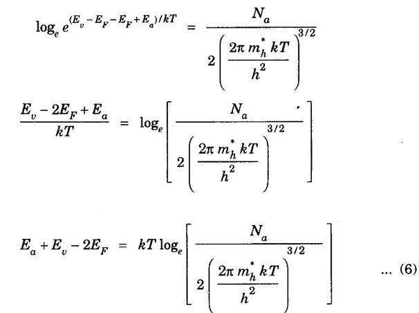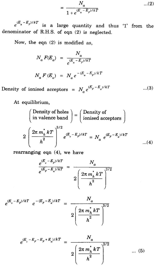 CONCENTRATION OF HOLES IN VALENCE BAND OF p-TYPE SEMICONDUCTORS [Derivation] In p-type semiconductor, acceptor energy level is just above valence band (fig. 3.10). Density of holes per unit volume in valence band is given by Ev → Energy corresponding to top most level of valence band. Density of ionised acceptors = NaF (Ea) ......(1) Na - the number of acceptor atoms per unit volume. Ea - acceptor energy level Here, F (Ea) is probability for finding electron in acceptor energy level ie., ionised acceptor. The eqn (1) becomes, density of ionised acceptors Taking log on both sides in eqn (5), we have Rearranging, Substituting eqn of EF, from (7) in (1), we get where ΔE = Ea - Ev is the ionisation energy of acceptors. • Density of holes in valence band is proportional to the square root of acceptor concentration. • At high temperature, we must take into account the intrinsic carrier concentration of semiconductor due to breaking of covalent bond along hole concentration produced by acceptor impurity. • At very high temperature, intrinsic carrier concentration over takes holes due to acceptor concentration. i.e., At very high temperature, p-type semiconductor behaves like an intrinsic semiconductor and acceptor concentration becomes insignificant.