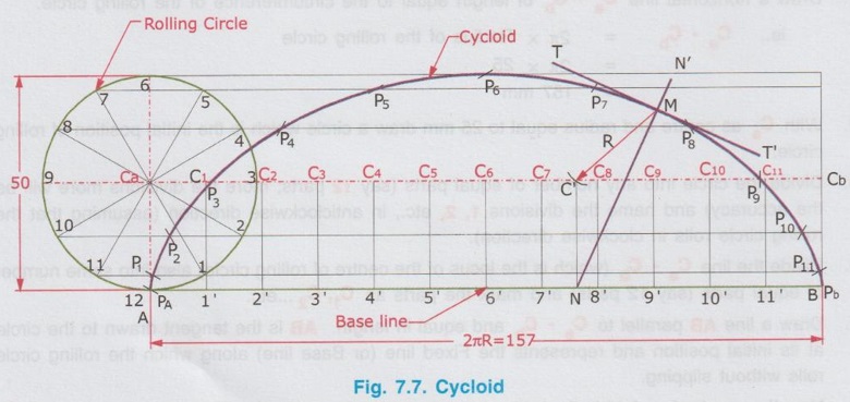 CONSTRUCTION OF CYCLOID 1. Cycloid is a curve generated by a point on the circumference of a circle which rolls without slipping along a fixed straight line, called Base line. 2. If the circle rolls in clockwise direction the cycloid is drawn on the right hand side and if the circle rolls in counter clockwise direction the cycloid is drawn on the left hand side. 3. When the rolling circle makes one revolution on the base line the distance travelled along the base line is equal to the circumference of the rolling circle. 4. A normal drawn at any point on the cycloid will pass through the point of contact between the directing line and rolling circle at that position. 5. If the rolling circle rolls in clockwise direction, number the division points on its circumference in anticlockwise direction as shown above and vice-versa. Example 1: Construct a cycloid having a generating circle of 50 mm diameter. Also draw tangent and normal at any point on the curve. 1. Draw a horizontal line Ca - Cb of length equal to the circumference of the rolling circle. ie., Ca - Cb = 2π × Radius of the rolling circle = 2π × 25 = 157 mm 2. With Ca as centre and radius equal to 25 mm draw a circle which is the initial position of rolling circle. 3. Divide the circle into any number of equal parts (say 12 parts; more the divisions more will be the accuracy) and name the divisions 1, 2, etc., in anticlockwise direction (assuming that the rolling circle rolls in clockwise direction). 4. Divide the line Ca - Cb (which is the locus of the centre of rolling circle) also into same number of equal parts (say 12 parts) and mark the parts as C1, C2...etc. 5. Draw a line AB parallel to Ca - Cb and equal in length. AB is the tangent drawn to the circle at its initial position and represents the Fixed line (or Base line) along which the rolling circle rolls without slipping. 6. Now the required cycloid is the path of a point P on the periphery of the rolling circle. Let Po be the initial position of the point P, which is the point of contact of rolling circle and the Base line. (ie., the point A (or) 12). 7. After one complete revolution the point P coincides with the point B. Now the cycloid is to be drawn between the points Po and B (or between the points A and B) 8. Draw horizontal lines through the points 1, 2.... etc. marked on the circumference of circle. 9. Draw perpendicular lines through the points C1, C2 … etc., perpendicular to the base line AB to intersect at 1', 2' ... etc., 10. With C1 as centre and radius equal to (C1 - 1') [ie., the radius of rolling circle 25 mm] draw an arc to cut the horizontal line drawn through the point 1. Name this point as P1. 11. Similarly with C2, C3 .... etc. as centres and radius equal to C2 - 2', C3 -3'... etc. draw arcs to cut the horizontal lines drawn through the points 2, 3... etc. at P2, P3 …. etc. Note: As C1 - 1', C2 - 2' - 2′, C3 - 3'.... are equal and equal to the radius of rolling circle, taking the radius of circle and C1, C2 … as centres draw arcs to cut the horizontal lines drawn through the points 1, 2.... etc., at P1, P2 … etc. Hence the step (9) can be avoided. 12. Draw a smooth curve joining the points Po, P1, P2, … P11, P12 and B to get the required cycloid. Let M be a point on the curve through which tangent and normal are to be drawn. i) With M as centre and radius equal to the radius of rolling circle (= 25 mm, given in the problem) draw an arc to cut the line Ca - Cb at C'. ii) From C', erect a perpendicular to the base line AB to intersect at N. iii) Join the points N and M and extend which is the required normal, NN'. iv) Draw a line perpendicular to the normal NN' and passing through the point M. Let this line be TT' which is the required tangent drawn through the point M.Points to understand