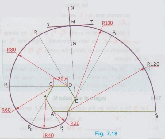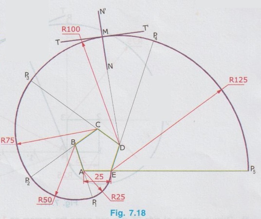 INVOLUTE OF A REGULAR POLYGON Example 8: Construct an involute of a regular pentagon of 25mm side. Also draw a tangent and a normal at any point on the curve. 1) Draw a regular pentagon of side 25 mm and name the vertices as A, B, C, D and E in clockwise direction. 2) Extend the sides AE, BA, CB, DC and ED. 3) With A as centre and radius AE, draw an arc to cut the side BA extended at P1, 4) With B as centres and B – P1 as radius draw an arc to cut the side CB extended at P2. 5) Similarly obtain the points P3, P4 and P5 as shown in Fig. 7.16. The curve passing through E, P1, P2.... P5 is the required involute. Let M be a point on the curve through which normal and tangent are to be drawn. i) since the point M is on the curve which is drawn with D as centre, Join D and M and extend, which is the required normal NN'. ii) Draw a line perpendicular to NN' at M. Let this line be TT', which is the required tangent. Example 9: Construct an involute of a hexagon of side 20mm. Also draw a tangent and normal at any point on the curve. 1) Draw a regular hexagon ABCDEF of side 20mm. 2) Extend the sides of hexagon BA, CB, DC..... etc. 3) With A as centre and radius AF draw an arc to cut the side BA extended at P1. 4) With B as centre and radius B-P1 draw an arc to cut the side CB extended at P2. 5) Similarly obtain the points P3, P4, P5 and P6. 6) Join the points F, P1, P2....P6 by a smooth curve which is the required involute. Let M be the point on the curve through which normal and tangent are to be drawn. i) since the point M is on the curve which is drawn with E as centre, Join E and M and extend, which is the required normal NN'. ii) Draw a line perpendicular to NN' through M. Let this line be TT', which is the required tangent.Procedure: