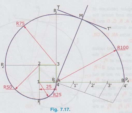 INVOLUTE OF A SQUARE Example 7: Construct an Involute of a square of side 25 mm. Also draw a tangent and normal at any point M. Construction: 1) Draw a square of side 25 mm and name the corners as 1, 2, 3 and 4 in clockwise direction. 2) Draw a tangent AB coinciding A at 4 of length equal to the perimeter of square. ie., AB = 4 × 25 = 100 mm. Divide AB into four parts and name the parts as 1', 2', 3′ and 4'. 3) Let P0 be the starting point of involute which coincides with 4 (and A). 4) Draw tangents through the points 1, 2 and 3. 5) With 1 as centre and A-1' as radius draw an arc to cut the tangent drawn through the point 1 to get P1. 6) Similarly obtain the other points P2, P3 and P4 by taking 2, 3 and 4 as centres and A-2', A-3′ and A-4' as radii respectively. (Note that P4 coincides with 4' and B). 7) Draw a smooth curve by joining the points P0, P1, P2, P3 and P4, which is the required involute of the square. Note : To join the points P1, P2 etc. arcs may be draw as below. with 1 as centre, and radius A-1′, draw an arct to join P0 and P1 with 2 as centre, and radius A – 2′, draw an arct to join P1 and P2 and so on. Let M be a point on the curve, through which normal and tangent are to be drawn. i) Join A and M and extend it, which is the required normal. ii) Draw a line perpendicular to AM at M. Let this line be TT', which is the required tangent.