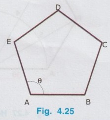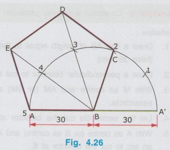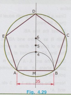 CONSTRUCTION OF REGULAR POLYGONS Any plane figure bounded by more than four straight lines is called a polygon. A polygon having equal sides and equal angles is called a Regular Polygon. Various types of polygons are explained in article 4.3 (Sl. No. 6). The straight lines that make up the regular polygon are called its sides and the points where the sides meet are called the vertices. The important geometric property of any polygon is the sum of interior angles in any polygon is equal to {(2n- 4) × 90° } where `n' is the number of sides of the polygon. Knowing the sum of interior angles in any polygon each included angle can be determined dividing by n. For example, for a pentagon having 5 sides as shown in Fig. 4.25. Sum of Interior angles = (2n - 4) × 90 = {(2 × 5) – 4 } × 90 = 540° ⸫ Each included angle, θ = 540/n = 540/5 = 108° Various methods of construction of different types of regular polygons are explained in this section. 1. Method I (Using "n" divisions of a Semicircle) Example 1 : Construct a regular pentagon of side 30 mm. Solution : 1. Draw a line AB of length equal to side of polygon. (here 30 mm) 2. Extend the line AB. 3. With B as centre and AB as radius (equal to side of polygon) draw a semicircular arc to cut the line AB extended at A'. 4. Divide the arc A - A' into n number of equal parts, where n is the number of sides of the polygon (here n = 5). 5. Name the parts as 1, 2, 3 etc. starting from the end A'. 6. Join B and 2 and note the point 2 as C. 7. Similarly Join the points 3 and 4 with B and extend. 8. With 2 as centre and radius equal to the side of polygon (here 30 mm) draw an arc to cut the line B3 produced at D. 9. similarly with D as centre and radius equal to the side of polygon (ie., 30 mm) draw an arc to cut the line B4 extended at E. 10. Join the points C, D, E and A to get the required pentagon ABCDE. Note : i) Divide the semi-circle into `n' number of divisions, where `n' is the number of sides of polygon and name the parts from A'. ii) But for any type of polygon always join the second division (Point number 2) from A'. iii) The method described above example can be followed to draw any polygon. Hexagon and Octagon drawn in this method are given below for comparison. 2. Method II : (Using Perpendicular Bisector) Example 2: Construct a regular pentagon of side 35 mm. Solution : 1. Draw a line AB of length equal to the side of polygon (here 35 mm) 2. Draw a perpendicular bisector to cut the line AB at M. 3. With M as centre and AM (or BM) as radius draw a semicircle. 4. Let the semicircle cut the bisector at 4. 5. With A as centre (or B as centre) and AB as radius draw an arc to cut the bisector at 6. 6. Locate the midpoint of the distance 4 to 6 at 5. 7. With Point 5 (the number which is equal to the number of sides) as centre and 5A (or 5B) as radius draw a circle which will pass through the points A and B. 8. Mark off the sides of the pentagon on the circle by cutting arcs with radius equal to AB. (ie., With B as centre draw an arc of radius equal to the side of pentagon to cut the circle at C. Then with C as centre and the same radius draw an arc to cut the circle at D and so on). 9. Name the divisions as C, D and E. 10. Join the points A, B, C, D and E with straight lines which is the required pentagon. Note : i) The above method can be followed to draw any polygon. ii) For any polygon always take the point of intersection of semicircle with bisector as 4 and the point of intersection of arc with bisector as 6 and then locate the midpoint of the distance 4 to 6 as 5. iii) After locating the point 5, take the distance 4 to 5 in a divider and mark it on the perpendicular bisector to mark the succeeding points 7, 8, 9 etc. such that the distances 4-5 = 5 – 6 = 6 - 7 = 7 - 8 etc. iv) Draw a circle taking the point 5 as centre for pentagon, point 6 as centre for hexagon, point 7 as centre for heptagon etc., and radius equal to the length measured from that point to A (or B). v) Finally mark off the required number of sides of the polygon on the circle by cutting arcs with radius equal to the side of polygon. Hexagon and Octagon drawn in this method are given below for comparison. Example 3 : Draw Pentagon, Hexagon and Octagon of side 40mm on a common base side. Solution : 1. Draw a line AB of 40mm length. 2. Draw bisector of AB and draw an arc with A as centre and AB as radius. 3. Mark the points 4 and 6 on the bisector and locate the mid point of 4-6 as 5. 4. Taking the point 5 as centre draw a circle with radius 5-A and mark off the vertices C, D and E on the circumference of circle. 5. Similarly draw Hexagon and Octagon taking the points 6 and 8 as centres and 6-A and 8-B as radius respectively. Mark off the vertices and join by straight lines.