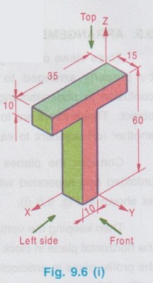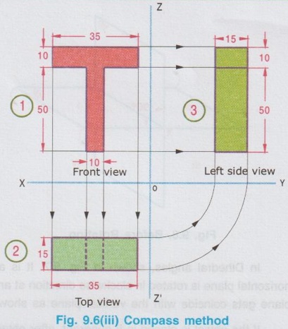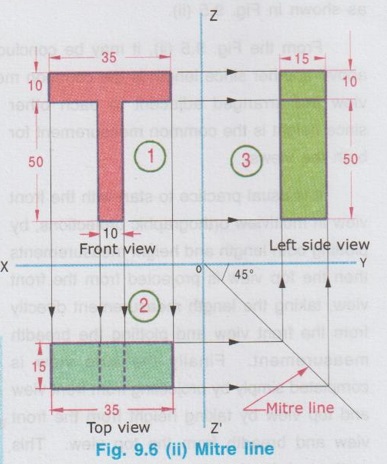 CONSTRUCTION OF THREE VIEWS WITH THE HELP OF MITRE LINE Pictorial view of an object is shown below in Fig. 9.6(i). For the position of observer shown in Fig. 9.6 (i), the Front view, Top view and the left hand side view are already shown in Fig. 9.5 (ii). The construction of these views are explained below. 1. Draw XY axis. 2. Draw ZZ' axis to intersect the axis XY at O, and perpendicular to XY axis. 3. Draw the front view as shown in fig. Ensure that some minimum space is maintained between bottom edge of front view and XY axis & right edge of front view and OZ axis, for dimensioning and writing foot note. 4. Draw vertical projectors from all the corners of the front view downwards and draw the top view, below XY axis, by leaving some minimum space between upper edge of top view and XY axis. Note: Both the dimensions, length and height are marked by using scale on front view, where as only one dimension, width is marked by using scale on top view, and the length of object in top view is simply projected down from the front view. 5. Draw Mitre line' at an angle of 45° from XY axis anto as shown in fig. (If right side view is required, draw ZZ' axis and mitre line on the left side of top view). 6. Draw horizontal projectors from all the corners of top view to intersect the mitre line and through these points of intersection, draw vertical upward projectors. 7. Draw Horizontal projectors from all the corners of the front view to intersect the vertical projectors, drawn from mitre line. 8. Join the corresponding points and complete the left side view as shown in fig. Note: Both the dimensions width and height on the side view are NOT marked by scale. They are directly projected from the other two views, Front view and Top view. Height is projected from the front view and the width is projected from the top view. To draw the side view an another method called "Compass method" is also followed as detailed below. Draw the front view and topview as explained in Mitre line method. (upto the step 4) i) Draw the horizontal projectors from all the corners of top view to intersect the OZ' axis and note the points of intersection. ii) With 'O' as centre and radius equal to the corresponding distances of points of intersection measured from O, draw arcs to cut OY axis and note down the points of intersection. iii) Draw the vertical projectors through these points of intersection to meet the horizontal projectors drawn from all the corners of the front view. iv) Join the corresponding points and complete the left side view as shown above. Note: If Right hand side view is required, draw OZ axis on the left side of front view and follow the same procedure explained above.Aliter to draw side view by compass method