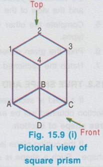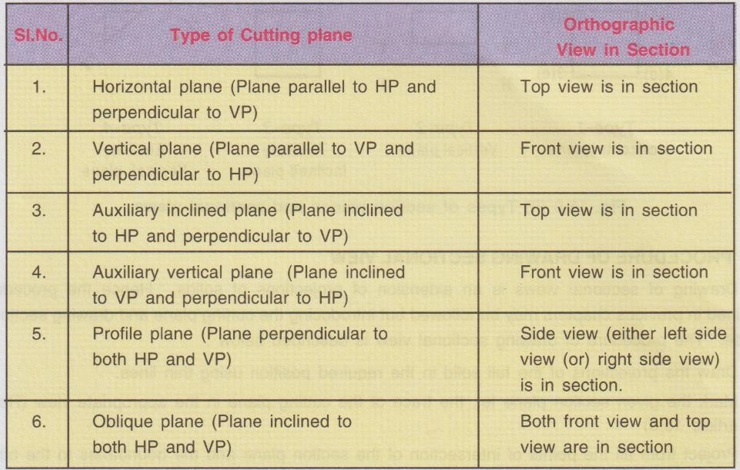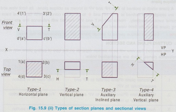 CUTTING PLANE AND SECTION Front view (or) Top view will be in section depends on the type of cutting plane with respect to the reference planes, which are summarised below: To have clear understanding, the four different types of cutting planes used to cut a square prism (shown in Fig. 15.9i) and the corresponding sectional views obtained are presented below in Fig. 15.9. (ii).Note : Cutting planes of profile plane and oblique plane are not in common use and hence not used in this text.