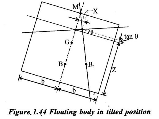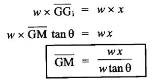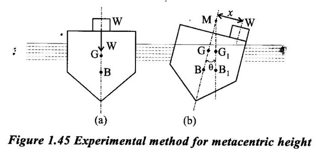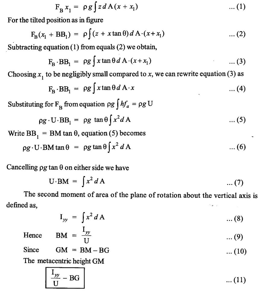 DETERMINATION OF META-CENTRE HEIGHT When the body has undergone small strip of dx at a distance x from the centre O, the depth of immersion can be expressed as z +x tan θ. Taking moments about a vertical plane at a distance x1 from O, the have For equilibrium position, Now, move the movable mass transversely through a distance x. The vessel gets tilted by an angle θ as shown in figure (b) which can be measured using a plumb line and protractor. In the new equilibrium position the centre of gravity is G1 and centre of buoyancy is B1. They will be in a vertical line with the metacentre M. Equating the moment due to the change of G and the moment due to change of position of the movable mass, we get, From the measured value of θ for any displacement x, the metacentric height of the floating body can be calculated using the above equation (1).1. Analytical Method