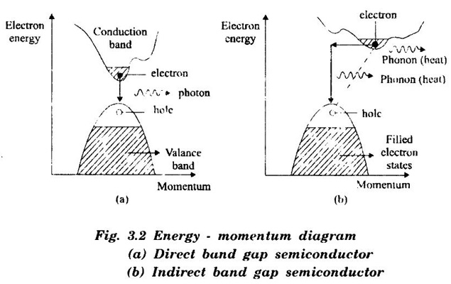 DIRECT AND INDIRECT BAND GAP SEMICONDUCTORS Semiconductors are also classified into (a) Direct band gap semiconductor (b) Indirect band gap semiconductor. The electrons and holes in a semiconductor have energy and momentum. The momentum (k) depends on energy (E). A plot of energy versus momentum is as shown in fig. 3.2 The lower curves represent energy and momentum values of holes in valence band of semiconductor. Similarly upper curves denote corresponding values for electrons in conduction band. In direct band gap semiconductor, the energy maximum of valence band and the energy minimum of the conduction band are having same momentum value. During the recombination of electron from conduction band with hole in valence band, the momentum of the electrons remains virtually constant. The energy equal to band gap energy is released as light photon. But, in the case of indirect band gap semiconductor, the maximum energy of valence band and minimum energy of conduction band are having different values of momentum. During recombination, electron first loses momentum such that it has momentum equal to the momentum corresponding to energy maximum of valence band. To conserve the momentum, emission of third particle known as a phonon is generated. Thus, in this type of recombination phonon is produced. When a suitable impurity is added to a pure semiconductor, its electrical conductivity changes. Based on this property, the semiconductors are classified into two types. They are (i) Intrinsic semiconductor or pure semiconductor (ii) Extrinsic semiconductor or impure semiconductor or Doped semiconductor