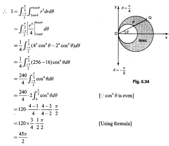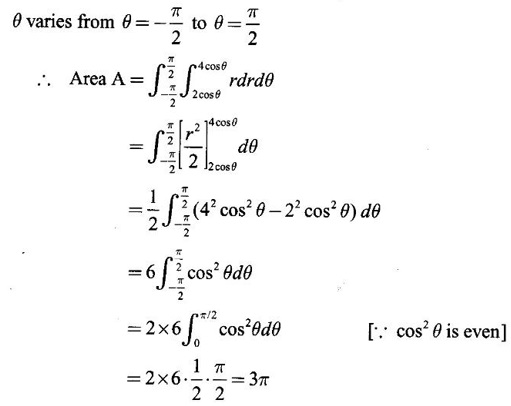 over the area bounded between the circles r = 2 cos θ and r = 4 cos θ.
