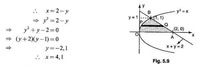 where R is the region bounded by the parabola y2 = x, the x-axis and the line x + y = 2, lying on the first quadrant.