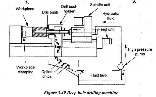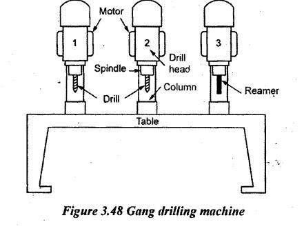 DRILLING MACHINES Drilling is the process of producing the hole on the workpiece by using a rotating cutter called drill. The machine on which the drilling is carried out is called drilling machine. The drilling machine sometimes is called drill press as the machine exerts the vertical pressure to originate a hole. The hole is produced either by giving an axial movement to the rotating drill or axially moving the work against the revolving drill. Though drilling may be done in a lathe or a vertical milling machine, it can conveniently be done economically and quickly in a drilling machine. Drilling machine can also be used for boring, counter-boring, counter- sinking, reaming, tapping and spot facing operations. Drilling machines are used in machine assembly, repair shop, tool room, maintenance work, agricultural machinery etc. The drilling machines are classified as follows. 1. Portable drilling machine 2. Sensitive drilling machine (a) Bench type (b) Floor type. 3. Upright drilling machine (a) Round column type or pillar type (b) Box column type or square section type. 4. Radial drilling machine (a) Plain type (b) Semi-universal type (c) Universal type. 5. Gang drilling machine 6. Multiple spindle drilling machine 7. Automatic drilling machine 8. Deep hole drilling machine. This type of machine is light in weight, compact in a smaller unit and easily handled with respect to the workpiece. It is used for making small holes (up to 18mm diameter) in large workpieces. It is operated by hand power, pneumatic power or electric power. Figure 3.44 shows the schematic diagram of an electrically operated portable drilling machine. Sensitive drilling machines are light-weight, high-speed machines which are generally bench type drilling machines but pillar type machines are also available. It is used for light duty work and drill holes up to 15mm diameter. There is no power feeding arrangement but feeding is purely on hand control of the operator so that the operator can sense the feeding or can control the feeding. Therefore, the machine is called sensitive drilling machine. The main parts of the sensitive drilling machines are base, column, table, spindle and driving mechanism. 1. Column: The column vertically stands on the base. It is a cylindrical post. It supports the table, the spindle head, motor and driving mechanism. 2. Table: The job on which the hole to be produced is mounted on the table. It can vertically be moved along the column and clamped at any position. It can also radially be adjusted around the column. It has T-slots for clamping workpiece or work holding device. 3. Spindle and driving mechanism: It is mounted at the top of the column. It has an electrical drive motor on one side whereas it has the spindle assembly on the other side. The motor drives the spindle through a cone pulley and V-belt arrangement. The belt can be shifted to different sets of pulleys to get different spindle speeds. The spindle is manually fed into the workpiece using a hand lever. The spindle has a Morse taper bore at its bottom end to hold the drill chack. Drill chuck holds the drill bit. Upright drilling machine is a higher capacity version of the sensitive drilling machine. It is a stationary floor mounted drilling machine. It is used for medium sized workpieces and having medium speed. The spindle head and the drive arrangement in this machine are similar to a sensitive drilling machine. But in this case, power-feeding arrangements are available. The main parts of the machine are base, column, worktable and spindle head. 1. Base: It is a supporting member on which all parts of the machine are mounted. It is generally made of cast iron. The top surface of the base is accurately machined. The base has T-slots which are used for mounting large workpiece directly on it. 2. Column: It is a vertical member mounted on the base and it carries the table, spindle and pulley drive mechanism. It should be very strong to take heavy cutting forces. It may be of a round type or box type. In a round type, the column is round in section also named as pillar. The table holding workpiece can be rotated 360° about the column for locating workpiece under the spindle. The drill up to 50 mm diameter is possible in this type. In a box type, the column is square in section, heavier, more strength and rigid than a round type. It can only be raised or lowered by an elevator screw and it will not rotate. The drill diameter more than 50 mm and up to 75 mm is possible by this type. 3. Table: The worktable is attached to the column by means of a clamping screw. The surface of the worktable is accurately machined and it has T-slots on it to hold workpieces. It can vertically move on the column and it can radially be adjusted about the column. As already stated, the table may be rotated about its own axis only in a round column type. 4. Spindle head and drive mechanism: The spindle head is mounted at the top of the vertical column. It is driven by a motor through a belt and step cone drive. The sensitive hand feed is available. A quick traverse hand feed is also available quickly to bring down the drill to the hole location and withdrawn after drilling. The different spindle speeds are obtained by using a step cone pulley arrangement. This type of machine is mounted on the floor and it is more suitable for drilling medium to large and heavy workpieces. The most significant feature of this machine is a radial arm which can swing about a column. The arm can also be moved up and down with respect to the column which can be locked at any desired position as per job size. Figure 3.47 shows the radial drilling machine. The main parts of the machine are base, column, radial arm, drill head, spindle speed and feed mechanism. 1. Base: It is a large rectangular casting. It supports the vertical column and table. The top surface of the base is accurately machined with T-slots to mount the large size workpieces. 2. Column: The column is a 