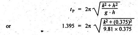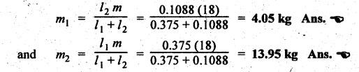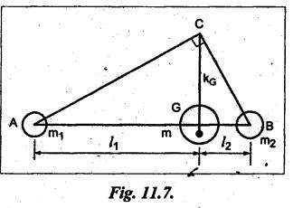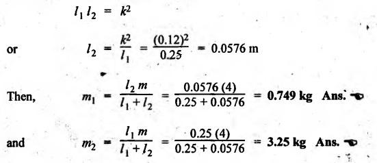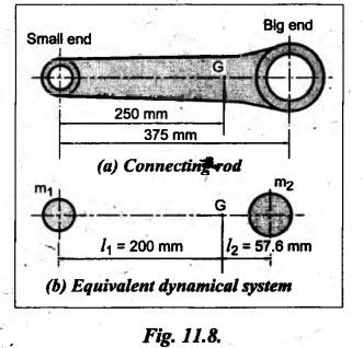 DYNAMICALLY EQUIVALENT SYSTEMS (EQUIMOMENTAL SYSTEM) • In dynamics problems, it is convenient to replace a rigid body by two separate concentrated masses placed at a fixed distance apart. • So far, we have not considered the weight of connecting rod in our force analysis. But in practice, we have to take into account the weight of the connecting rod and the inertia of the connecting rod. As the motion of the connecting rod is not linear, its inertia cannot be found as such. In such cases, we have to use the concept of dynamically equivalent system, in which the mass of the connecting rod is replaced by two separate concentrated masses placed at a fixed distance apart. 1. The mass of the rigid body must be equal to the sum of masses of two concentrated masses. 2. The center of gravity of the two masses must coincide with the center of gravity of the rigid body. 3. The sum of mass moment of inertia of two masses about their center of gravity is equal to the mass moment of inertia of the rigid body. Note In the above three conditions, if only first two conditions are satisfied, then the system is said to be statistically equivalent system. If all three conditions are satisfied, then system is called the dynamically equivalent system. 2. Determination of Two Masses of Dynamically Equivalent System Let us consider a rigid body as shown in Fig.11.6(a). Let m = Mass of the body, k = Radius of gyration about its center of gravity G, m1 and m2 = Two masses which form a dynamical equivalent system, l1 = Distance of mass m1 from G, l2 = Distance of mass m2 from G, and L = Total distance between the masses m1 and m2 The two masses m1 and m2 can be determined by both analytically and graphically. 1. Analytical Method Applying the three conditions of equivalent dynamical system, we get Substituting the values of m1 and m2 in equation (iii), we get If radius of gyration k of the rigid body is known, by choosing l1 arbitrarily, l2 can be determined from the above equation. Note • When the radius of gyration k is not known, then the position of the second mass may be obtained by considering the body as a compound pendulum. • We know that for a simple pendulum to have the same frequency of oscillation as that of a Compound pendulum, the equivalent length of a simple pendulum is given by where h = Distance of C.G from the point of suspension. From equation (11.23), l1l2 = k2. This means that if the first mass m1 is considered to be situated at center of suspension A (at a distance l1 from G), then the second mass m2 is situated at the center of oscillation or percussion of the body, which is at a distance of l2 = k2/ l1. • It may be useful to recollect the expressions for time period and frequency of simple and compound pendulums. 1. Simple pendulum: 2. Compound pendulum: where k = Radius of gyration about an axis passing through its centre of gravity, and h = Distance of point of suspension from the C.G 2. Graphical Method Consider a rigid body of mass m, which acts at G, and radius of gyration k, as shown in Fig.11.7. The mass m can be replaced by two masses m1 and m2 so that the system becomes dynamically equivalent. The position of mass m1 is arbitrarily fixed at A. The position of mass m2 is determined graphically as below: Draw perpendicular CG at G equal to k. Then join AC and draw a line perpendicular to AC intersecting AG produced at B, as shown in Fig.11.7. The point B gives the position of mass m2. From similar triangles ACG and BCG, we can write, (which is the same expression as in analytical method) Example 11.16 A connecting rod of length 375 mm between centers has a mass of 4 kg. The center of gravity is 250 mm from the small end and the radius of gyration about an axis through the centre of gravity perpendicular to the plane of motion is 120 mm. Determine dynamically equivalent system having one mass at the centre of small end and the other at a point somewhere in between the centre of big end and the centre of gravity. Given data: l = 375 mm = 0.375 m; l1 = 250 mm = 0.25 m; m = 4 kg; k = 120 mm = 0.12 m. Solution: Fig.11.8(a) shows the given connecting rod whereas Fig.11.8(b) shows the equivalent dynamical system. Let m1 = Mass at small end centre, and m2 = Mass at the centre of big end and centre of gravity. We know that for dynamically equivalent system, Example 11.17 The length of a connecting rod of an engine is 500 mm measured between the centers and its mass is 18 kg. The centre of gravity is 125 mm from the crank pin centre and the crank radius is 100 mm. Determine the dynamically equivalent system keeping one mass at the small end. The frequency of oscillation of the rod, when suspended from the centre of small end is 43 vibrations per minute. Given data: l = 500 mm = 0.5 m; m = 18 kg; l2 = 125 mm = 0.125 m; r = 100 mm = 0.1 m. Solution: We know that Frequency of oscillation = Number of vibrations per second The connecting rod is shown in Fig.11.9(a). Now let us find the radius of gyration k of the connecting rod, considering it as a compound pendulum, about an axis passing through its centre of gravity, G. We know that for a compound pendulum, time period of oscillation (tP), On solving, we get k = 0.202 m It is given that one of the masses is located at the small end centre. Let the other is located at a distance l2 from the centre of gravity G, as shown in Fig.11.9(b). For a dynamically equivalent system, we can write • For our solution, this data is superfluous. Then the masses at the small end centre (m1) and at the big end centre (m2) are given by1. Conditions of Equivalent Dynamical System