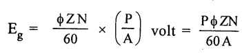 E.M.F. EQUATION OF A GENERATOR Let P = number of poles, ϕ = flux/pole, webers (Wb), Z = total number of armature conductors, = number of slots × number of conductors / slot, N = rotational speed of armature, r.p.m, A = number of parallel paths in armature and E = generated e.m.f. per parallel path in armature. Average emf generated per conductor = dϕ/dt volt Now, flux cut per conductor in one revolution, dϕ = Pϕ Wb. Number of revolutions / second = N/60 ⸫ Time for one revolution, dt = 60/N seconds Hence, according to Faraday's laws of electromagnetic induction, E.m.F. generated per conductor = PϕN/60 volts For a lap wound generator: Number of parallel paths, A = P Number of conductor (in series) in one path = Z/P ⸫ E.m.f generator per path = For a wave wound generator : Number of parallel paths, A = P Number of conductor (in series) in one path = Z/2 ⸫ E.m.f generator per path = In general, generated e.m.f where A = P ... for lap winding = 2 ... for wave winding.