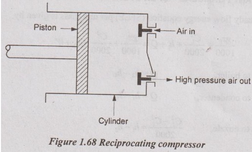 FIRST LAW OF THERMODYNAMICS - APPLICATION TO OPEN SYSTEMS A boiler is a device which is used to generate high-pressure steam by supplying heat to the water. In this system, the heat energy is stored in the steam. Therefore, the internal energy (U) exists. The flow energy (pV) exits due to movement of water. But, there is no work done by the system. The potential energy (gz) and kinetic energy (C2/2) are very small. So, it can be neglected. Therefore, z1 = z2, C1 = C2 and W = 0 Applying the above conditions in SFEE, it becomes Q = (h2 - h1) …. (1.74) A condenser (Figure 1.64) is a device used to condense a hot steam into water by using a coolant. The main function of the condenser is to transfer the heat from steam to coolant. In this system, there is no work done, change in kinetic and potential energies (i.e. W = 0, z1 = z2 and C1 = C2). Applying the steady flow energy equation to this system, it can be written as h1 + Q = h2 Q = h2 - h1 ... (1.75) Nozzle is a device which increases the velocity of kinetic energy of the working substance at the constant pressure drop. In this system, (1) There is no work done by the system (W = 0). (2) There is no heat transfer taking place (Q = 0). (3) There is no potential energy (z1 = z2). Applying the steady flow energy equation to this system, it can be written by The above equation shows that the increase in kinetic energy will result a decrease in enthalpy. From above equation, it can be rewritten as Since, the initial velocity C1 is very small, it can be neglected. Then, the above equation becomes The expansion of the fluid in a nozzle is treated as reversible adiabatic or isentropic. Turbine is a device which converts the potential energy of working fluid into mechanical work. The turbine is fully insulated. Therefore, there is no heat transfer (Q = 0). In the turbine, the expansion of working fluid is treated as reversible adiabatic or isentropic. The change in potential and kinetic energy is negligible. Therefore, z1 = z2 and C1 = C2. Applying the SFEE to the above system, it can be written as h1 = h2 + W Work output, W = h1 - h2 …. (1.76) Air compressor is a device which is used to compress air from low pressure to high pressure. The input for this compressor is atmospheric pressure. Compressors are classified into two types: (i) Rotary compressor (ii) Reciprocating compressor. (i) Rotary compressor: It is a type of compressor which compresses air to high pressure by using rotors. It supplies a large of quantity air at moderate pressure. In the compressor, (i) There is no heat transfer (Q = 0) (ii) There is no change in potential and kinetic energies (z1 = z2 and C1 = C2) Then, the steady flow energy equation is written as h1 = h2 - W A negative sign in - W shows that the work is done on the system. ⸫ W = h2 - h1 ... (1.77) It shows that the work done increases due to increase in enthalpy. In this type of compressor, the piston reciprocates in the cylinder for producing high- pressure air. It produces very small quantity of air with very high pressure. Larger area is made to contact with the surroundings for producing small quantity of air when compared to rotary compressor. Hence, the heat transfer is more. In this system, the potential and kinetic energies are negligible (z1 = z2 and C1 = C2) The steady flow energy equation for this system is expressed by h1 - Q = h2 - W Here, negative sign in - W indicates the work is done on the system and - Q indicates the heat rejection to the surroundings. W = Q + (h2 - h1) ... (1.78)1. Boiler (or) Steam Generator