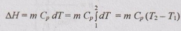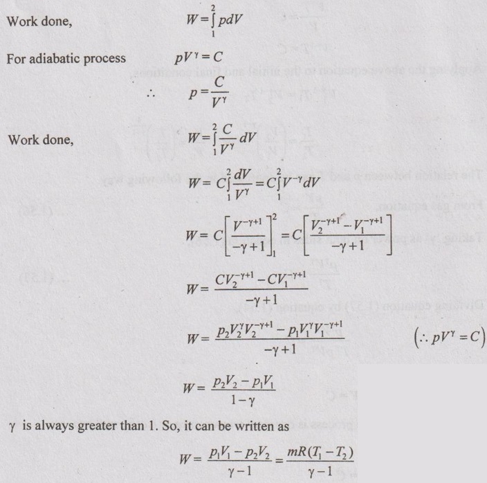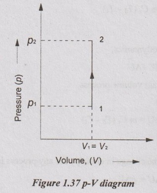 FIRST LAW OF THERMODYNAMICS APPLICATION TO CLOSED SYSTEMS (NON-FLOW PROCESSES) The processes occurring in closed systems which do not permit the transfer of mass across their boundaries are known as non-flow processes. In non-flow processes, there are only heat transfer and work transfer but there is no mass transfer into or out of the system. During the energy flow, the changes take place in pressure, volume, temperature, internal energy, heat, work, etc. A gas may be heated or cooled and expanded or compressed by different methods. According to the above-said statement, there are different processes as given below: (a) Constant volume or Iso-choric process (b) Constant pressure or Iso-baric process. (c) Constant temperature or Isothermal process (d) Hyperbolic process (e) Reversible adiabatic or Isentropic process (f) Polytropic process (g) Free expansion process (h) Throttling process. Before discussing the various processes, some important terms related to these processes should be familiar for better understanding. Work (W): For any non-flow process, the mechanical work is mathematically given by where p = Pressure in N/m2 V = Volume in m3 Note: Area under p-V diagram represents the work done during the process and the area under T-s diagram represents heat transfer during the process. Internal energy (U): Internal energy is defined as the heat energy stored in the gas at a given temperature. Mathematically, it can be expressed by ΔU = m Cv ΔT ….. (1.49) where m = Mass of the system in kg Cv = Specific heat capacity at constant volume in kJ/kgK T = Temperature of the gas (K) The increase of heat energy stored in the gas due to raise in temperature is known as change in internal energy. Mathematically, the change in internal energy can be written as ΔU = m Cv (T2 - T1) …(1.50) where T2 = Final temperature after heating T1 = Initial temperature before heating. Enthalpy (H): Enthalpy is defined as the total heat of the substance. It is equal to the sum of internal energy (U) and pressure volume product (i.e. pV). Enthalpy, H = U + pV For unit mass, it can be written as Specific enthalpy, h = u + pv Enthalpy is also a function of temperature. Mathematically, it is given by Enthalpy, H = mCp T Change in enthalpy, ΔH = ΔU + pΔV ... (1.51) Change in enthalpy, ΔH = m Cp ΔT ... (1.52) When a gas is heated at constant volume (i.e. fixed space), its temperature and pressure will increase. It is called constant volume process. Since the gas is heated in the fixed space, no work is done by the system. The entire heat energy supplied to the gas is stored in the gas itself as internal energy. The gas is heated from state 1 to 2 as shown in Figure 1.37. In Figure 1.37, p1 and p2 = Pressures at initial and final states T1 and T2 = Temperatures at initial and final states V1 and V2 = Volumes at initial and final states. In constant volume process, there is no area under p-V diagram. Therefore, there is no work done during the process. Relation between p, V and T: From characteristic gas equation, Work done (W): Work done during any process is given by Change in internal energy (ΔU): From equation (1.49), the change in internal energy for any process is given by ΔU = m Cv dT Heat transfer (Q): From first law of thermodynamics, Q = W + ΔU We know that for constant volume process, W = 0 Q = ΔU = m Cv (T2 - T1) Change in enthalpy (ΔH): From equation (1.51), the change in enthalpy for any process is given by ΔH = ΔU + pΔV In this process, V1 = V2 and hence ΔV = 0 ⸫ ΔH = ΔU = m Cv (T2 - T1) When a gas is heated at constant pressure, both volume and temperature will increase. The gas expands in the cylinder by heating and thus, the work is done by the gas. Relation between p, V and T: From characteristic gas equation Work done (W): For any process, W = p (V2 - V1) W = p2V2 - p1V1 = m R (T2 - T1) Area under the curve in p-V diagram represents the work done during the process. Change in internal energy (ΔU): For any process, ΔU = m Cv dT ΔU = m Cv (T2 - T1) Heat transferred (Q): Q = W + ΔU = p (V2 - V1) + m Cv (T2 - T1) Q = m R(T2 - T1) + m Cv (T2 - T1) Q = m (Cp - Cv)( T2 - T1) + m Cv (T2 - T1) (⸪ R = Cp - Cv) Q = m Cp (T2 - T1) Change in enthalpy (ΔH): ΔH = m Cp dT ΔH = m Cp (T2 - T1) In this process, the temperature of the working substance remains constant, the pressure decreases and the volume increases. Hence, there is no change in temperature, there is no change in internal energy and enthalpy because both internal energy and enthalpy are the functions of temperature. Isothermal process is very slow process so that the temperature is constantly maintained during the process. Relation between p, V and T: Work done (W): For any process The characteristic gas equation is given by PV / T = C Here, T = constant pV = constant pV = C p = C/V Substituting the value of p in equation (1.53), Change in internal energy (ΔU): ΔU = m Cv dT = m Cv (T2 - T1) Since T2 = T1 ΔU = 0 There is no change in internal energy. Heat transferred (Q): From first law of thermodynamics, Q = W + ΔU In this process, ΔU = 0 Change in enthalpy (ΔH): ΔH = m Cp dT Since, dT = 0 ⸫ ΔH = 0 There is no change in enthalpy. The hyperbolic process follows the law of pV= C. This process is identical to isothermal process. The isothermal process is applicable to gases only but the hyperbolic process is applicable to vapours. For example, expansion of vapour is not isothermal process, it is said to be hyperbolic process. All properties such as work done, heat transfer, change in internal energy and change in enthalpy are same as isothermal process. This process follows the law pVγ = constant; where γ be the adiabatic index. Adiabatic process is the process in which neither heat is received nor rejected. Simply, there is no transfer of heat during the process. There are two ways a process can be adiabatic: Either the system is well-insulated so that only a negligible amount of heat can pass through the b