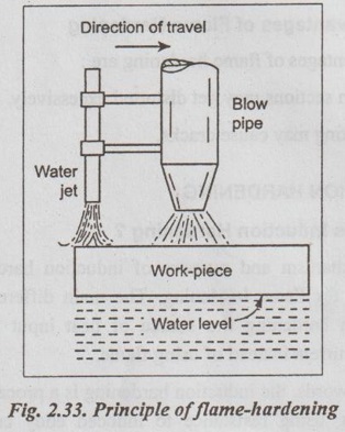 FLAME HARDENING ✓ Flame hardening is the process of selective hardening with a combustible gas flame as the source of heat for austenitizing. ✓ Flame hardening can be performed only on steels with a sufficiently high carbon content - at least 0.4% C (to allow hardening). The surface to be hardened is heated to a temperature above its upper critical temperature, by means of a travelling oxy-acetylene torch, as shown in Fig.2.33. Then it is immediately quenched by a jet of water issuing from a supply built into the torch-assembly. Thus, the surface hardening results when the austenitized surface is quenched by the water spray that follows the flame. The flame hardening technique is suitable for the plain carbon steels with carbon contents ranging from 0.40% to 0.95% and low- alloy steels. It is used to improve wear resistance and surface hardness of teeth of gears, wheels, sheaves, bushings, shafts, mill rolls, cams, spindles, hand tools, etc. The advantages of flame hardening are as follows: 1. There is practically no distortion of workpiece because only small section of steel is heated. 2. The process is more efficient and very economical for larger works. 3. As heating rate is high the surface of work remains clean. 4. It is more suitable for small quantities because it is versatile and equipment cost is less. The disadvantages of flame hardening are: 1. Very thin sections may get distorted excessively. 2. Overheating may cause cracks.1. What is Flame Hardening?