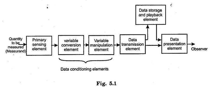 FUNCTIONAL ELEMENTS OF AN INSTRUMENT Most of the measurement systems contain three main functional elements. They (i) Primary sensing element (ii) Variable conversion element (iii) Data presentation element. ● Primary sensing Element: which senses the quantity under measurement. ● Variable conversion Element: which modifies suitably the output of the primary sensing element. ● Variable Manipulation Element: The signal gets manipulated here preserving the original nature of it. ● Data Transmission Element: The transmission of data from one another is done by the data transmission element. ● Data presentation Element: The display or readout devices which display the required information about the measurement. The quantity under measurement makes its first contact with primary sensing element of a measurement system here, the primary sensing element transducer. This transducer converts measured into an analogous electrical signal. The output of the primary sensing element is the electrical signal. It may be a voltage a frequency or some other electrical parameter. But this output is not suitable for this system. For the instrument to perform the desired function, it may be necessary to convert this output to some other suitable form while retaining the original signal. Consider an example, suppose output is an analog signal form and the next of system accepts input signal only in digital form. Therefore we have to use analog to digital converter in this system. The main function of variable manipulation element is to manipulation element is to manipulate the signal presented to it preserving the original nature of the signal. Here, manipulation means a change in numerical value of the signal. Consider a small example, an electric amplifier circuit accepts a small voltage signal as input and produces an output signal which is also voltage but of greater amplifier. Thus voltage amplifier acts as a variable manipulation element. The information about the quantity under measurement has to be conveyed to the personal handling the instrument or system for control or analysis purposes. The information conveyed must be in the form of intelligible to the personnel. The above function is done by data presentation element. The output or data of the system can be monitored by using visual display devices may be analog or digital device like ammeter, digital meter etc. In case the data to be record, we can use analog or digital recording equipment. In industries, for control and analysis purpose we can use computers. The final stage in a measurement system is known as terminating stage. when a control device is used for the final measurement stage it is necessary to apply some feedback to the input signal to accomplish the control Objective. The term signal conditioning includes many other functions in addition to variable conversion and variable manipulation. In fact the element that follows the primary sensing element in any instrument or instrumentation system should be called signal conditioning element. When the element of an instrument is physically separated, it becomes necessary to transmit data from one to another. This element is called transmitting element. The signal conditioning and transmitting stage is generally known as intermediate stage.