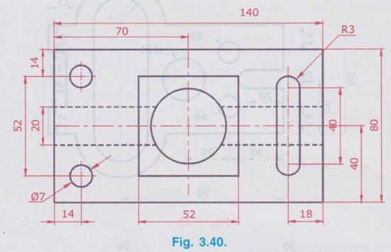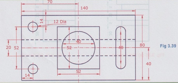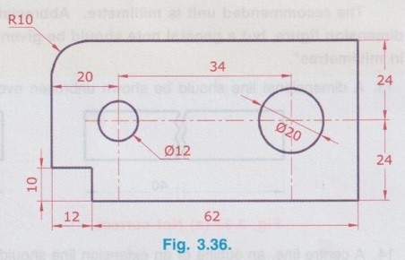 GENERAL RULES OF DIMENSIONING Following are the rules of dimensioning generally followed while dimensioning a drawing. 1. Dimension lines and projection lines are drawn as continuous thin lines. 2. Projection lines should extend slightly beyond the dimension line approximately to 3mm. 3. Numerals and letters should be bold and large enough to ensure easy readings. 4. Dimension values should be placed approximately at the middle unless unavoidable due to lack of space. 5. Dimensions should not be placed within a view. (Fig. 3.27) 6. Dimension lines should be placed at sufficient distance from the parts being dimensioned, preferably at a distance of 6 to 10 mm (Fig. 3.28). 7. Extension and projection lines should not cross other lines unless that is unavoidable.(Fig. 3.29) For this condition, smaller dimensions should be placed near the view and larger dimensions should be placed away from the view. 8. Dimensions are to be given from visible outlines rather than from hidden lines (Fig. 3.30). 9. Each end of dimension line should be defined by an arrow head, proportional to the line thickness and size of the drawing. The ratio of length to width of arrow head should be 3: 1. 10. Each dimension should be given only once. (Fig. 3.31). For this condition, a dimension given in one view (say height in front view) should not be repeated in another view (the same height in side view). 11. Two systems of dimensioning should not be mixed up in one drawing. (Fig. 3.32) For this rule, only one system of dimensioning either aligned (or) unidirectional should be followed throughout in a particular drawing. 12. Dimensions in one particular drawing should be expressed in one unit only. The recommended unit is millimetre. Abbreviated 'mm' should not be written with each dimension figure, but a general note should be given in title block that “All the dimensions are in millimetres”. 13. A dimensional line should be shown unbroken even if the feature is broken (Fig. 3.33) 14. A centre line, an outline or an extension line should not be used as a dimension line. (Fig. 3.34) 15. If the space is limited the arrowheads may be reversed or may be replaced by a clearly marked dot. (Fig. 3.35). Example 1 : Read the dimensioned drawing of a lock plate shown in Fig. 3.36 and redraw the figure to full size and dimension it in (i) Aligned system and (ii) Unidirectional system as per Bureau of Indian standards. Take all the dimensions are in mm. The mistakes to be corrected in the given drawing are : i) The dimensions 20 and 34 are to be placed outside the view. ii) Dimensions of the holes (12ϕ and ϕ 20) are not indicated properly. iii) Radius of the arc is not indicated properly. iv) All the dimensions should be written following any one system, either aligned or unidirectional. The given diagram is redrawn and dimensioned properly in aligned system and unidirectional system as shown in Fig. 3.37 and Fig. 3.38 respectively. Example 2 : A Machine part having dimensions marked in a wrong way is shown in Fig. 3.39. Redraw the figure and complete the dimensioning as per BIS by following aligned system. The given drawing is redrawn and dimensions are marked properly in Aligned system as shown in Fig. 3.40. 1. Read the drawings shown in Fig. 3.41 to Fig. 3.45 and redraw to their full size. Complete the dimensions as per Indian Standards. Take all the dimensions are in millimetres.