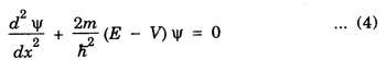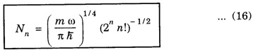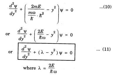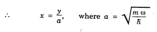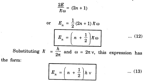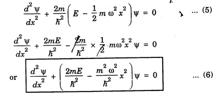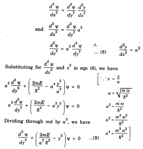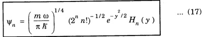 HARMONIC OSCILLATOR (Qualitative) Definition A particle undergoing simple harmonic motion is called a harmonic oscillator. In harmonic oscillator, the force applied is directly proportional to the displacement and is always directed towards the mean position. Examples. Familiar examples are; a simple pendulum, an object floating in a liquid, a diatomic molecule and an atom in a crystal lattice. If applied force moves the particle through x, then restoring force F is given by The potential energy of the oscillator is where k is force constant. In harmonic oscillator, angular frequency is given by Squaring on both sides where m - mass of the particle Substituting k in eqn (1), we have The time - independent Schrodinger wave equation for linear motion of a particle along the x-axis is: where E – Total energy of the particle, V - Potential energy and Ψ - Wave-function for the particle which is function of x alone. Substituting for V in equation (4) we get: This is Schrodinger wave equation for the oscillator. To simplify eqn. (6), a dimensionless independent variable y is introduced. It is related to x by the equation y = ax ... (7) Now we have Differentiating Substituting for a2 The wave equation for the oscillator is satisfied only for discrete values of total energies given by where, n = 0, 1, 2, ......, and v is the frequency of the classical harmonic oscillator, given by From eqn. (13),we get the following conclusions: 1. The lowest energy of the oscillator is obtained by putting n = 0 in eqns (12) and (13) it is: This is called the ground state energy or the zero point vibrational energy of the harmonic oscillator. The zero-point energy is the characteristic result of quantum mechanics. The values of En in terms of E0 are given by: where n = 0, 1, 2, 3, ... 2. The eigen-values of the total energy depend only on one quantum number n. Therefore all the energy-levels of the oscillator are non-degenerate. 3. The successive energy-levels are equally spaced; the separation between two adjacent energy-levels being In the figure 7.2 the horizontal lines show the energy levels and the dashed curve is parabola representing the potential energy V = 1/2 kx2 For each value of the parameter (i) the normalization constant Nn given by: (ii) the exponential factor (iii) a polynomial Hn (y), called Hermite polynomial in either odd or even powers of y. Thus the general formula for the nth wave function is: The first six Hermite polynomials are given in the following table: For lowest (ground) state, n = 0 This is the lowest value of energy, called zero point energy. Even if the temperature reduces to absolute zero, the oscillator would still have an amount of energy 1/2 hv. In old quantum mechanics, the energy of nth level... whereas in wave mechanics A comparison of two results shows that the only difference in old quantum mechanics and wave mechanics is that all the equally spaced energy levels are shifted upward by an amount equal to half the separation of energy levels i.e., 1/2 hv (equal to zero point zero). The existence of zero point energy is an important feature of wave mechanics and has been found to be experimentally true. • Experiments in scattering of light by crystals at low temperature show that when temperature is decreased, the intensity of scattered light tends to a finite limit and remains unchanged with further decrease in temperature. • It indicates that the oscillations of the atom in the crystal do not stop even at absolute zero.Wave equations for the oscillator
