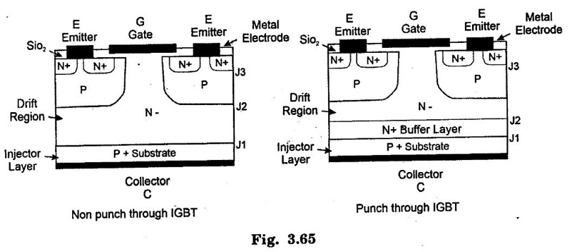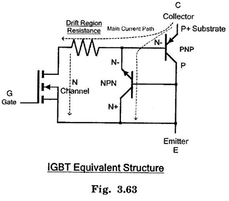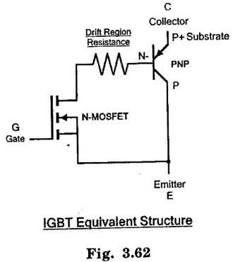 IGBT The IGBT or Insulated Gate Bipolar Transistor is the combination of BJT and MOSFET. Its name also implies the fusion between them. "Insulated Gate" refers to the input part of MOSFET having very high input impedance. It does not draw any input current rather it operates on the voltage at its gate terminal. "Bipolar” refers to the output part of the BJT having bipolar nature where the current flow is due to both types of charge carriers. It allows it to handle very large currents and voltages using small voltage signals. This hybrid combination makes the IGBT a voltage-controlled device. It is a four-layer PNPN device having three PN junctions. It has three terminals Gate (G), Collector(C) and Emitter (E). The terminal's name also implies being taken from both transistors. Gate terminal as it is the input part, taken from MOSFET while the collector and emitter as they are the output, taken from the BJT. IGBT is made of four layers of semiconductor to form a PNPN structure. The collector (C) electrode is attached to P layer while the emitter (E) is attached between the P and N layers. A P+ substrate is used for the construction of IGBT. An N- layer is placed on top of it to form PN junction J1. Two P regions are fabricated on top of N- layer to form PN junction J2. The P region is designed in such a way to leave a path in the middle for the gate (G) electrode. N+ regions are diffused over the P region as shown in the figure. The emitter and gate are metal electrodes. The emitter is directly attached to the N+ region while the gate is insulated using a silicon dioxide layer. The base P+ layer inject holes into N- layer that is why it is called injector layer. While the N- layer is called the drift region. Its thickness is proportional to voltage blocking capacity. The P layer above is known as the body of IGBT. The N- layer is designed to have a path for current flow between the emitter and collector through the junction using the channel that is created under the influence of the voltage at the gate electrode. Equivalent Structure of IGBT As we know that IGBT is the combination of input of MOSFET and output of BJT, it has an equivalent structure to N-channel MOSFET and a PNP BJT in Darlington configuration. The resistance of the drift region can also be incorporated. If we look at the structure of the IGBT above, there is more than one path for the current to flow. The current path is directed from collector to emitter. The first path is “collector, P+ substrate, N-, P, emitter". This path is already mentioned using the PNP transistor in an equivalent structure. The 2nd path is "collector, P+ substrate, N, P, N+, emitter". To include this path, another NPN transistor must be included in the structure as shown in the figure below. The two terminals of IGBT collector (C) and emitter (E) are used for the conduction of current while the gate (G) is used for controlling the IGBT. Its working is based on the biasing between Gate-Emitter terminals and Collector-Emitter terminals. The collector-emitter is connected to Vcc such that the collector is kept at a positive voltage than the emitter. The junction J1 becomes forward biased and J2 becomes reverse biased. At this point, there is no voltage at the gate. Due to reverse J2, the IGBT remains switched off and no current will flow between collector and emitter. Applying a gate voltage VG positive than the emitter, negative charges will accumulate right beneath the SiO2 layer due to capacitance. Increasing the VG increases the number of charges which eventually form a layer when the VG exceeds the threshold voltage, in the upper P-region. This layer form N-channel that shorts N- drift region and N+ region. The electrons from the emitter flow from N+ region into N- drift region. While the holes from the collector are injected from the P+ region into the N- drift region. Due to the excess of both electrons and holes in the drift region, its conductivity increase and starts the conduction of current. Hence the IGBT switches ON. There are two types of IGBT based on the inclusion of N+ buffer layer. The inclusion of this extra layer divides them into symmetrical and asymmetrical IGBT. Punch through IGBT The Punch through IGBT includes N+ buffer layer due to which it is also known as an asymmetrical IGBT. They have asymmetric voltage blocking capabilities i.e. their forward and reverse breakdown voltages are different. Their reverse breakdown voltage is less than its forward breakdown voltage. It has faster switching speed. Punch through IGBTs is unidirectional and cannot handle reverse voltages. Therefore, they are used in DC circuits such as inverters and chopper circuits. Non Punch through IGBT They are also known as symmetrical IGBT due to the absence of extra N+ buffer layer. The symmetry in structure provides symmetrical breakdown voltage characterístics i.e. the forward and reverse breakdown voltages are equal. Due to this reason, they are used in AC circuits. Unlike BJT, IGBT is a voltage-controlled device that requires only a small voltage at its gate to control the collector current. However, the gate-emitter voltage VGE needs to be greater than the threshold voltage. Transfer characteristics of the IGBT show the relation of input voltage VGE to output. collector current IC. When the VGE is 0v, there is no IC and the device remains switched off. When the VGE is slightly increased but remains below threshold voltage VGET, the device remains switched off but there is a leakage current. When the VGE exceeds the threshold limit, the IC starts to increase and the device switches ON. Since it is a unidirectional device, the current only flows in one direction. The given graph shows the relation between the collector current I and collector- emitter voltage VCE at different levels of VGE. At VGE < VGET the IGBT is in cutoff mode and the IC = 0 at any VCE. At VGE > VGET, the IGBT goes into active mode, where the IC increases with an increase 