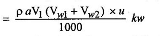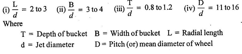 IMPULSE TURBINE - PELTON WHEEL (OR) PELTON TURBINE Lester A pelton of California (USA) designed a impulse turbine which is known as pelton turbine (or) wheel. The pelton turbine is the most commonly used type of impulse turbine. This turbine is also called free jet or constant pressure (or) tangential flow impulse turbine ✓ It is a impulse turbine. ✓ Only kinetic energy of water is available at inlet of turbine. ✓ It is working of high head and low discharge. ✓ Work is done only due to change in kinetic energy of water. ✓ Working pressure is equal and constant at atmospheric pressure. ✓ It is a Tangential flow and low specific speed turbine. From figure 5.4 the main components of a pelton wheel turbine are, (a) penstock, (b) nozzle (c) Spear, (d) Runner and buckets (e) Deflector (f) casing (g) Brake nozzle. (a) Penstock It is a rigid pipe which is used to carries the water from reservoir through the dam gate valve to the turbine under the pressure. The penstock is provided with control valves for the regulation of water flow to the turbine. (b) Nozzle It is used to convert the net available pressure energy of the water into kinetic energy by the nozzle in the form of jet. The jet of water coming from the nozzle strikes the buckets with a high velocity and leaves the buckets with comparatively low velocity and produces impact on the buckets. Due to this impact, turning moment act on the runner which rotates the runner at a high speed. (c) Spear It is used to regulate the flow rate of water into the turbine. Due to linear movement of the spear, space between nozzle and spear increases (or) decreases in such a way, so flow rate of water also increase (or) decrease accordingly as shown in figure 5.5. (d) Runner and buckets Runner of a pelton turbine is a circular disc which is mounted on a horizontal shaft. The buckets are fixed to the periphery of the runner uniformly at equal distance. The shape of the bucket is like a double hemispherical cup. Each bucket is divided vertically into two part by a splitter. The splitter splits the jet of water into two equal parts without any shock. The two parts of the same jet move side ways in opposite direction. The jet is deflected by the buckets through an angle of 160° to 170°. Average value is taken as 165°. The buckets are generally fastened by two (or) more both to the runner as shown in figure 5.6. (e) Deflector A deflector is provided which is hinged to the casing to deflect the set of water away from striking the buckets in case the load on turbine suddenly reduces. It prevents the runner of turbine attaining unsafe speeds are called runaway speed. (f) Casing The casing of the pelton wheel turbine do not perform any hydraulic function. It prevent the splashing of water and discharge the water into tail race. It can also be used as a safe guard against accidents. (g) Brake nozzle It is used to stop the rotation of the runner in a short period of time. When stopping the runner, firstly water supply to the turbine is stopped by operating the spear and then braking jet of water issuing from the brake nozzle will strike on the back of the buckets. This braking jet exerts torque on the runner in opposite direction of motion of the runner. This opposite torque is known as brake torque and responsible to stops the runner in a short period of time. Working: The penstock carrying water from the reservoir at high head to the turbine, it is connected to a branched pipe fitted with the nozzle at the end. The whole of the pressure energy of the water is converted into the kinetic energy with the help of nozzle before supply to the turbine runner. The water comes out of the nozzle in the form of a jet with very high velocity. This high velocity of jet is strike on a series of buckets mounted on the periphery of a wheel keyed to the turbine shaft. The impulsive force of the jet exerted on the series of buckets setup the wheel in rotation in the directino in which jet is impinging. The water as it flow over the buckets, the velocity of flow will be decrease and atmospheric pressure remain constant. This turbine in also called constant pressure turbine (or) velocity turbine (or) free jet turbine. Pelton wheel turbine is best suited for high head and low discharge. (a) Head loss in the penstock Head loss due to friction between water and penstock is called head loss in the penstock. It is calculated by Darcy's formula. (b) Head loss in the nozzle: Pressure energy at the inlet of the nozzle does not completely converted into kinetic energy at the outlet, some of the energy lost due to friction inside the nozzle. This energy lost due to friction is called head loss in the nozzle. (c) Hydraulic fosses: This losses are due to bucket friction, eddy formation and kinetic energy of leaving water. (d) Leakage losses: The whole jet of water does not strike on the buckets. Therefore, some of energy of water go for waste. This loss is called as leakage loss. (e) Mechanical losses: The power available at shaft is always less than power produced by the runner because some power is consumed in overcoming friction in bearing and some in overcoming friction in bearing and some in overcoming the windage losses. So the losses due to bearing friction and windage are called mechanical losses. (f) Generator losses: In generator, complete input shaft power (or) mechanical power is not converted into electrical power, some input shaft power can be lost in generator, is called generator loss. Consider a water jet striking at the splitter of a bucket as shown in figure 5.8. The velocity triangles of the water jet are drawn at the inlet and outlet of the bucket as shown in figure 5.7. The symbols used for determining workdone by jet from velocity triangles are N - Speed of the wheel (or) turbine. D - Diameter of the pelton wheel. D - diameter of jet. u - peripheral velocity of runner. V1 - absolute velocity of jet at inlet. V2 - absolute velocity of jet at outlet. Vrl = Rel