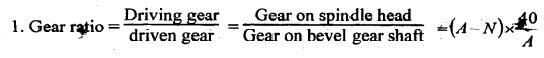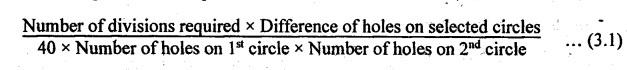 INDEXING METHODS There are different methods of indexing. The selection of indexing depends on the number of divisions required and the type of dividing head used. The common methods of indexing are given below. 1. Direct or rapid indexing 2. Plain or simple indexing 3. Differential indexing 4. Compound indexing 5. Angular indexing. This method of indexing is used for indexing a large number of identical pieces by very small divisions. The operation is performed on a plain dividing head and universal dividing head. When a universal dividing head is used, the worm and worm gear are disengaged. The indexing is done with the help of a direct index plate. This index plate is fitted to the front end of the spindle nose. The rapid index plate having 24 slots is fitted to the frame. The spindle can be rotated by hand and locked at any position by engaging the front indexing pin with the hole provided on the rapid indexing plate. A spring loaded pin is pushed into any one of the holes to lock the spindle with the body while indexing. This lock pin is released and the spindle is rotated by a hand wheel. Thus, the index plate is turned through the required revolution. The dividing head spindle and the workpiece are also turned through the same amount. To find the index movement, the total number of holes in the rapid index plate is divided by the number of divisions required on the work i.e. Required ratio = N/n where N = Number of slots on the periphery of the index plate i.e. 24 n = Number of divisions required on the workpiece. This method of indexing is used for divisions which could not be indexed by direct or rapid indexing. Simple indexing can be carried out by either a plain indexing head or a universal dividing head. This method of indexing involves the use of crank, worm, worm wheel and index plate. The worm wheel generally carries 40 teeth and the worm is single threaded. Hence, one turn of the index crank turns the index head spindle 1/40 of a complete turn or through 9o. Otherwise, 40 turns of the crank will move the spindle by one complete revolution. Parkinson and Cincinnati dividing heads are supplied with a single plate only. It carries holes on both sides as given below: Front side: 24, 25, 28, 30, 34, 37, 38, 39, 41, 42, 43 Back side: 46, 47, 49, 51, 53, 54, 57, 58, 59, 62, 66 The crank movement for dividing the periphery of the workpiece into the number of equal divisions will be as follows. Index crank movement = 40/N where N = Number of divisions required. The method of compound indexing is used when the number of divisions required on the job is outside the range of simple indexing. The operation involves the use of two separate simple indexing movements. 1. By turning the crank to a definite amount in one direction in the same way as in simple indexing, and 2. By turning both index plate and crank in the same or reverse direction, thus adding further movement to or subtract from the first stage. Principle of compound indexing: The principle of compound indexing can be illustrated by taking an example. Let us consider, the crank is turned 3 holes on a 15 holes circle and the index plate and crank both turned further 4 holes on 12 holes circle. These two movements will turn the worm through: Since 40 turns of the worm turn the workpiece through 1 revolution, 8/15 turn of the worm will turn the work through 8/15 × 1/40 i.e.= 1/75 of a revolution. This will enable 75 divisions on the work. Another example is wherein the second operation the index plate and the crank are rotated in a reverse direction to that adopted in the first operation. Suppose, the crank is turned 6 holes on the 18 holes circle in one direction and then the index plate along with the crank, turned 4 holes on 16 holes circle in a direction opposite to the former. On account of these two movements, the worm will be turned through Now, the corresponding movement of the work will be Thus, 480 divisions can be obtained on the work. The following procedure for compound indexing is to be followed. 1. Factorise the number of divisions required. 2. Factorise the standard number 40. 3. Select any two circles on the same plate and on the same side for trial. Factorise their difference. 4. Factorise the number of holes of the circle. 5. Factorise the number of holes of the other circle. After obtaining these factors place them as follows. Suppose, we get 1/x after simplification and if a and b are the number of holes on the two circles, the indexing movement is given by After finding the values of a and b, the algebraic sum of the two movements is checked by the formula Differential indexing principle is very much similar to the compound indexing. This process is also carried out in two stages. Stage 1: The crank is moved in a certain direction. Stage 2: Movement is added or subtracted by moving the plate by means of a gear train. The dividing heads are supplied with standard sets of change gears. Brown and Sharpe supply the dividing head with the following change gears. 24 (2 Nos.), 28, 32, 40, 44, 48, 56, 64, 72, 86, 100 The simultaneous movement of the index plate is obtained by a gear train. The gear train connects the spindle and the bevel gear shaft. The index plate can be made to rotate in the same direction as the crank or opposite to the crank rotation. By this rotation of the index plate, the actual movement of the index crank at every indexing is automatically increased or decreased i.e., when the index plate rotates in the same direction of the crank, the resulting movement of the crank is increased. When the index plate rotates in the opposite direction of the crank, the resulting actual movement is decreased. During differential indexing, the index plate locking pin should be taken out to make the plate free to rotate. The bevel gear shaft and the dividing head spindle are connected by a gear train as shown in Figure 3.139. When the crank is turned, the drive is given to the spindle through worm and worm