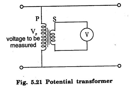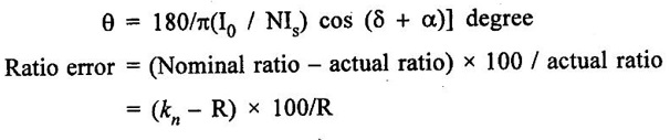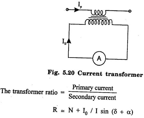 INSTRUMENT TRANSFORMER Transformers are used in ac systems for the measurement of current, voltage, power and energy. Instrument transformers are classified according to their uses as Current Transformer (CT) and Potential Transformer (PT). It has a primary winding with a small number of turns, connected in series with a line carrying the current to be measured. The secondary winding has a larger number of turns and is connected to a current meter or a relay coil as shown in fig. 5.20 where N = turns ratio = no. of turns of secondary winding / no. of turns of primary winding. I0 = exciting current I = secondary current δ = angle between the secondary induced emf and secondary current and α = angle between I0 and working flux Phase angle θ is the angle by which I, when reversed, differs in phase from the primary current. where kn = nominal ratio = rated primary current / rated secondary current Potential transformer is used to operate voltmeters, potential coils of wattmeters and relays from high voltage lines. The primary winding of the transformer is connected across the lines carrying the voltage to be measured and the voltage circuit is connected across the secondary winding (Fig. 5.21) The transformer ratio R is where N = turns ratio Is = secondary winding current Ic = exciting current Im = magnetizing component of no-load (exciting) current β = phase angle of secondary load circuit Vs = secondary winding terminal voltage r1, x1 = resistance and reactance of primary windings R2, X2 = equivalent resistance and reactance of a transformer referred X2 to secondary side. The phase angle θ is Instrument transformers extend the range of the ac measuring instruments. 1. Moderate size instrument transformers are used for metering. 2. Cheaper single range instrument can be used to cover a large current or voltage range. 3. The metering circuit consumers lower power and is isolated from high power circuits. 4. Several instruments can be operated from a single instrument transformer.1. Current Transformer (CT)
