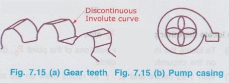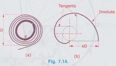 INVOLUTE Involute is a curve traced by an end of a string or thread, when it is unwound from a circle or a polygon, the thread being kept tight. Involute may also be defined as a curve traced out by a point on a straight line which rolls around a circle or a polygon, without slipping. Consider a circle of diameter `D' wounded by a thread as shown in Fig. 7.14. When the thread is unwound, keeping the thread is tight, for one complete revolution of circle, the thread will have a profile as shown in Fig. 7.14(b). It is to be noted that when the thread is unwound, the thread is always tangential to the circle and a point on thread will generate an involute profile. Involute can be drawn for a circle or any polygon. Gear teeth profiles (Fig. 7.15a) and casings of centrifugal pumps are of involute of a circle.