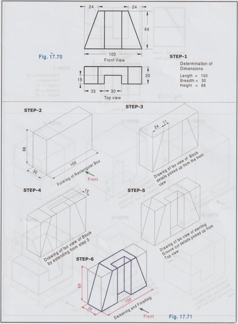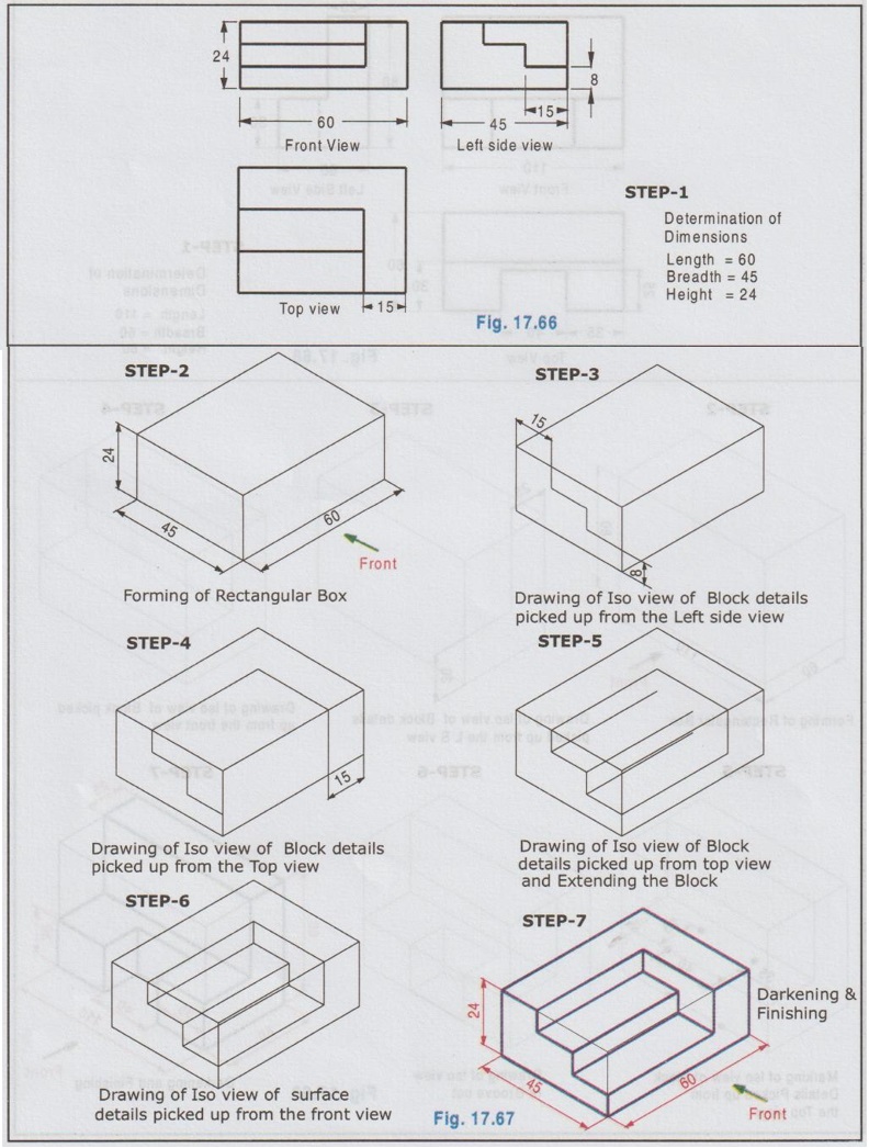 ISOMETRIC PROJECTIONS OF OBJECTS FROM THEIR ORTHOGRAPHIC PROJECTIONS While drawing isometric view from the available multiview orthographic projections, the following points should be followed. 1. It is essential to visualise the shape of object before starting the drawing. 2. The location of the origin of the isometric axes to be fixed in such a way that it shows the maximum information of the object. 3. Box method (or) Offset method can be followed. 4. Front view of the object can be drawn on either left isometric (or) right isometric plane. 5. Length of the object is normally taken on x (or) y axis. 6. The construction lines (drawn as thin lines) to be retained in order to understand the method of drawing. 7. The hidden lines and curves of the object may be shown only if they are necessary. 8. Dimension the object properly. The following examples describe the procedure of drawing isometric projection / view from the given multiview orthographic projections. Example 37: Draw the isometric view of the object, of which orthographic projections are shown in Fig. 17.66. Example 38: For the orthographic projections shown in Fig. 17.68 draw the Isometric view. Example 39: Front view and top view of an object are shown in Fig. 17.70. Draw its isometric view. Example 40: For the orthographic projections shown in Fig. 17.72, draw the isometric view. Example 41: For the orthographic projections shown in Fig. 17.74, draw the isometric view. Example 42: Front view and side view of an object are shown in Fig. 17.76. Draw its isometric view. Example 43 : For the orthographic projections shown in Fig. 17.78, draw the isometric view. Example 44: Front view and right side view of an object are shown in Fig. 17.80. Draw its isometric view. Example 45: For the orthographic projections shown in Fig. 17.82, draw its isometric view. Example 46: For the orthographic projections shown in Fig. 17.84 draw its isometric view. Example 47: For the orthographic projections shown in Fig. 17.86, draw its isometric view. Isometric view is drawn as shown in Fig. 17.87.