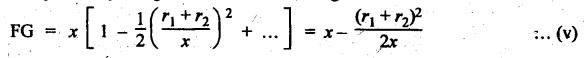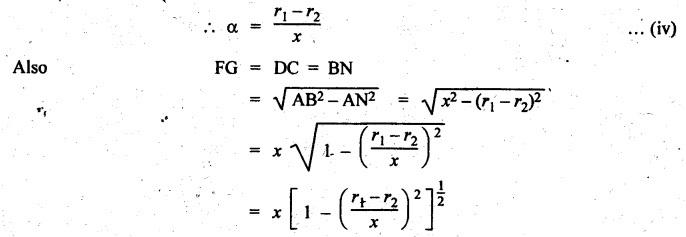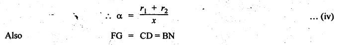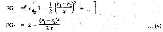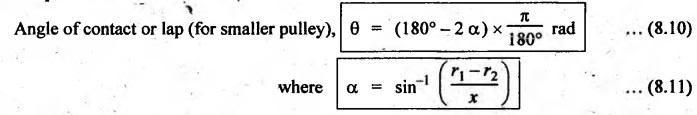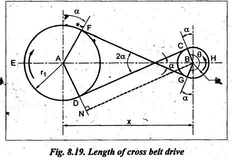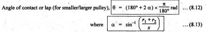 LENGTH OF BELT Length of belt can be determined practically as well as mathematically. In practical method, a string is taken round the pulleys and its length is measured. Mathematical expressions for length for the open and the crossed belt can be derived as follows. We know that in open belt drive, both the pulleys rotate in the same direction as shown in Fig.8.18. Let A and B be centres of the pulleys. Let r1 and r2 = Radii of the larger and smaller pulleys, x = Distance between the centres A and B, L = Total length of the belt, and 2α = Angle subtended between the straight portions of the belt. From B, draw a dotted line BN parallel to DC. Total length of the belt is given by L = Arc EF + FG+ Arc GH + Arc HC + CD + Arc DE But Arc EF = Arc DE; Arc GH = Arc HC; FG = CD Since a is very small, therefore sin α = α Expanding this equation by using binomial theorem, we get Substituting equations (ii) to (v) in equation (i), we get Note (i) The equation (8.6) gives approximate length of belt for open belt drive. (ii) The exact length of belt for an open belt drive is given by the equation We know that in cross belt drive, both the pulleys rotate in the opposite direction, ás shown in Fig.8.19. Let A and B be the centres of the pulleys. Let r1 and r2 = Radii of the larger and smaller pulleys, x = Distance between the centres A and B, L = Total length of the belt, and 2α = Angle between the belting. From B, draw a dotted line BN parallel to CD. Extend AD to AN. Total length of the belt is given by L = Arc DE + Arc EF + FG + Arc GH + Arc HC + CD But Arc DE = Arc EF; FG = CD; Arc GH = Arc HC Since a is very small, therefore sin α = α Again from triangle ABN, Expanding this equation by using binomial theorem, we get Substituting equations (ii) to (y) in equation (i), we get Note (i) The equation (8.8) gives approximate length of belt for cross belt drive. (ii) The exact length of belt for cross belt drive is given by the equation For open belt drive: For cross belt drive: Example 8.3 Find the lengths for both open belt drive and cross belt drive necessary to drive a pulley of 750 mm diameter running parallel at a distance of 12 metres from the driving pulley of diameter 4000 mm. Given data: d2 = 750 mm = 0.75 m; x = 12 m; d1 = 4000 mm = 4 m. Solution: (a) For open belt drive: We know that the length of open belt drive, (b) For cross belt drive: We know that the length of cross belt drive,1. Length of an Open Belt Drive