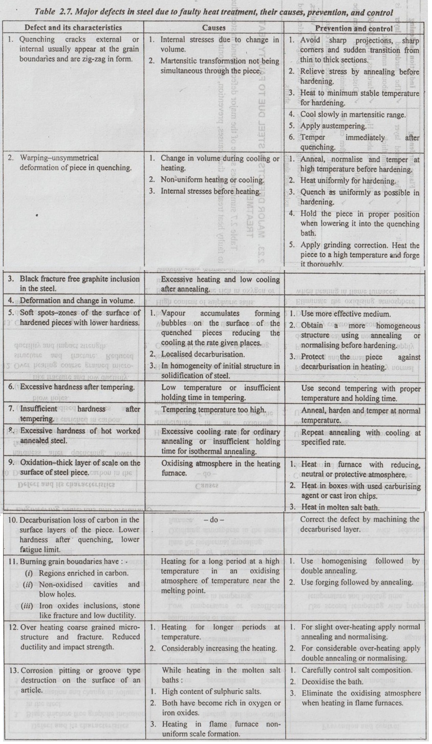 MAJOR DEFECTS IN STEEL DUE TO FAULTY HEAT TREATMENT Table 2.7 summarises some of the major defects found in steel due to faulty heat treatment, their causes, prevention, and control. Table 2.7. Major defects in steel due to faulty heat treatment, their causes, prevention, and control