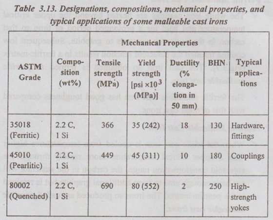 MALLEABLE CAST IRON ✓ Malleable iron is a cast iron that has been heat treated so that it has significant ductility and malleability.↑ ✓ Composition: The composition of a typical malleable cast iron is given below: Carbon - 2.0 to 3.0% Silicon - 0.6 to 1.3% Manganese - 0.2 to 0.6% Phosphorus - 0.15% Silicon - 0.10% Remaining is iron ✓ Malleable iron is produced by heat treating unalloyed (2.5% C, 1.5% Si) white iron. During the heat treatment process, the cementite in the white cast iron structure breaks down into ferrite and graphite clumps (or nodules). This graphite nodules, also called tempered carbon, appears like poncorn. This rounded graphite shape permits a good combination of strength and ductility. † For the meaning of these terms, refer Unit 5, Section 5.1. ✓ The structure of a typical malleable iron is shown in Fig.3.7. Two types of malleable irons, depending on the type of heat treatment cycle used to produce, are: 1. Ferritic malleable iron, and 2. Pearlitic malleable iron. ✓ The white iron castings are heated beyond the upper critical temperature and held for a prolonged period of time so that carbon in the cementite converts to graphite. Subsequent low cooling through the eutectoid reaction results in a ferritic matrix (Fig.3.7). The cast iron so obtained is termed as ferritic malleable cast iron. ✓ The ferritic malleable cast iron has good toughness compared with that of other cast irons. ✓ When the white cast iron is cooled from temperatures higher than a upper critical temperature more rapidly through the eutectoid transformation range, the carbon in the austenite will not have enough time to form additional graphite but is retained in the pearlite matrix. The irons so produced are called pearlitic malleable cast irons. ✓ Pearlitic malleable cast iron is characterised by higher strength and lower ductility than ferritic malleable cast iron. ✓ The designation system for malleable cast iron given by ASTM, is a five-digit number. ✓ The first three digits represents the minimum yield strength in psi of the iron, and the last two digits represents the percent of elongation. ✓ For example, a grade 32510 malleable cast iron has a minimum yield strength of 32.5 × 103 (≈ 224 MPa) psi and 10% elonga- tion; and a grade 35018 has a minimum yield strength of 35 × 103 psi (≈ 242 MPa) and 18% elongation. ✓ Table 3.13 presents the typical compositions, and mechanical properties of some malleable cast irons. The important properties of malleable cast iron are given below: 1. The malleable cast iron possess good ductility and malleability properties than grey cast iron. 2. It exhibits high yield strength and tensile strength. 3. It is not brittle as grey cast iron. 4. It has high Young's modulus and low coefficient of thermal expansion. 5. It exhibits excellent impact strength and fatigue strength. 6. It has good wear resistance and vibration damping capacity. 7. It also has excellent machinability. ✓ Malleable cast irons are widely used in the automobile industries, because of their combination of castability, shock- resistance, and good machinability. Typical components include brake-shoes, pedals, levers, wheel-hubs, axle-housings, connecting rods, transmission gears, and door hinges. ✓ They are also suitable for the manufacture of thin sections which require high ductility. Typical components include pipe fittings, parts for agricultural machinery, switchgear equipment, and fittings for bicycle and motorcycle frames.1. What is Malleable Cast Iron?