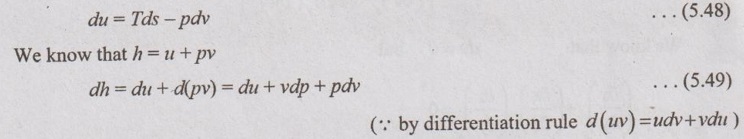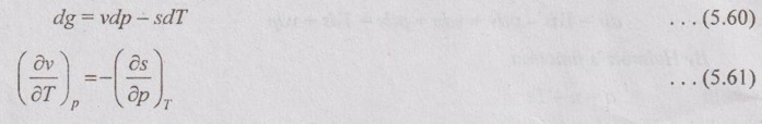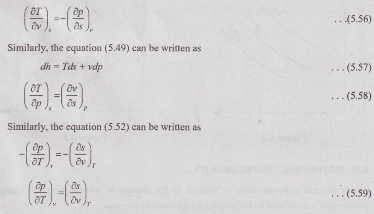 MAXWELL'S EQUATIONS Maxwell's equations relate the entropy to the three directly measurable properties such as p, v and T for pure simple compressible substances. From first law of thermodynamics, Q = W + ΔU Rearranging the parameters, Q = ΔU + W Tds = du + pdv [⸪ Q = Tds and W = pdv] So, du equation becomes, dh = Tds - pdv + vdp + pdv = Tds + vdp …. (5.50) By Helmotz's function, a = u - Ts ⸫ da = du - d(Ts) = du – Tds - sdT ….. (5.51) Substituting the value of du (5.48) in equation (5.51), da = Tds - pdv - Tds - sdT=-pdv – sdT ... (5.52) By Gibbs functions G = h - Ts Dg = dh - d(Ts) = dh - Tds – sdT ... (5.53) Substituting the value of dh (5.50) in equation (5.53), So, dg becomes dg= Tds + vdp – Tds – sdT (⸪ dh = Tds + vdp) dg = vdp – sdT ... (5.54) By inverse exact differential, it can be written the equation (5.48) as du = Tds – pdv ... (5.55) These equations (5.58), (5.59), (5.60) and (5.61) are Maxwell's equation.Substituting the value du in equation (5.49),