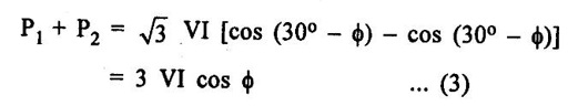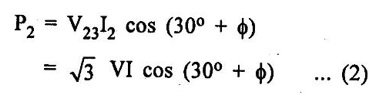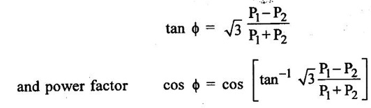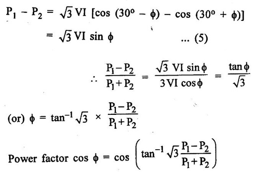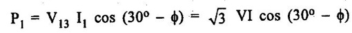 MEASUREMENT OF POWER IN THREE PHASE CIRCUITS 1. Three wattmeter method : The connections as employed for a 3 phase 4 wire system are shown in fig. 5.11 In this case, the common point C of pressure coils and the neutral O of the load concide and therefore, ν = 0 and ν1 = ν1', v2 = ν2', v3 = ν3' Sum of the instantaneous reading of the wattmeters. Instantaneous power of load Hence these three wattmeters measure the power of the load. 2. Two wattmeter method: In a three phase three wire system we require 3 elements, but if we make the common points of the pressure coils coincide with one of the lines, then we will require only n – 1 = 2 elements. Instantaneous power consumed by load Let us consider two wattmeters connected to measure power in three phase circuit as shown in fig. 5.12 (Star connection) and fig. 5.13 (Delta connection) Star (Wye) Connection: Instantaneous reading of p1 wattmeter p1 = i1 (v1 - v3) Instantaneous reading of p2 wattmeter p2 = i2 (v2 - v3) Sum of instantaneous readings of two wattmeters From Kirchhoff's law (Fig. 5.12) ⸫ Sum of instantaneous readings of two wattmeters = v1 i1 + v2 i2 + v3 i3 Therefore, the sum of the two wattmeter reading is equal to the power consumed by the load. This is irrespective of whether the load is balanced or unbalanced. Delta Connection: Instantaneous reading of p1 wattmeter. p1 = - v3 (i1 - i3) Instantaneous reading of p2 wattmeter p2 = v2 (i2 - i1) ⸫ Sum of instantaneous readings of wattmeters p1 and p2; From Kirchhoff's voltage law, Hence sum of instantaneous readings of two wattmeters Therefore, the sum of the two wattmeter readings is equal to the power consumed by the load. This is irrespective of whether the load is balanced or unbalanced. Fig. 5.14 shows the phasor diagram for a balanced star connected load of fig. 5.12 Let V1, V2, V3 be the rms values of phase voltage and I1, I2, I3 be the rms values of phase currents. The load is balanced, therefore, Phase voltages, V1 = V2 = V3 = V (say) Line voltages, V13 = V23 = V12 = √3V Phase currents, I1 = I2 = I3 = I (say) Line currents, I1 = I2 = I3 = I Power factor = cos ϕ. The phase currents lag the corresponding phasor voltages by an angle ϕ. The current through wattmeter P1 is I1 and voltage across its pressure coil is V13. I1 leads V13 by an angle (30° – ϕ). ⸫ Reading of P1 wattmeter, The current through wattmeter P2 is I2 and voltage across its pressure coil is V23 I2 lags V23 by an angle (30° + ϕ) ⸫ Reading of P2 wattmeter, Sum of reading of two wattmeters : This is the total power consumed by load. ⸫ Total power consumed by load P = P1 + P2 ……. (4) Difference of readings of two wattmeters Effect of power factor on the readings of wattmeters : (a) With unity p.f. cos ϕ = 1 and ϕ = 0 The readings of the two wattmeters are : At unity power factor, total power = P = 3VI cos ϕ = 3VI Thus at unity power factor, the readings of the two wattmeters are equal, each wattmeter reads half of the total power. (b) When p.f = 0.5, we have ϕ = 60° Therefore, Therefore, when the power factor is 0.5, one of the wattmeters reads zero and the other reads total power. (c) When p.f = 0, we have ϕ = 90°. Therefore, Therefore, with zero power factor, the readings of the two wattmeters are equal but of opposite sign. It should be noted that when the power factor is below 0.5, one of the wattmeters will give negative indication. Under these conditions in order to read the wattmeter, we must either reverse the current coil or the pressure coil connections. The wattmeter will then give a positive reading but this must be taken as negative for calculating the total power. 3. One wattmeter method : The method can be used only when the load is balanced. The connections are shown in fig. 5.15. The current coil is connected in one of the lines and one end of the pressure coil to the same line, other end being connected altemately to the other two lines. The phasor diagram is shown in fig. 5.16. We have, V1 = V2 = V3 = V I1 = I2 = I3 = I and V13 = V12 = √3V Reading of wattmeter when the switch is at 3: Reading of wattmeter when the switch is at 2: Sum of the two wattmeter readings, Thus the sum of the two readings is the power consumed by the load, or P = P1 + P2 Proceeding as in the case of two wattmeter method,