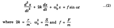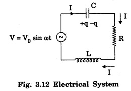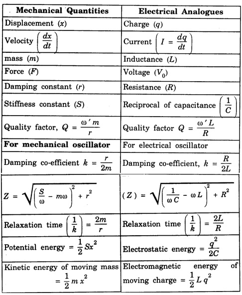 MECHANICAL AND ELECTRICAL ANALOGUES In a mechanical vibration, the particles have both kinetic energy and potential energy. The total energy is sum of these two energies. The energy of mechanical oscillator is damped by an opposing force (for example air friction). The equation of motion is given by In the case of spring An electrical oscillating system has potential energy which is stored as electrostatic energy in a capacitor. Further during electrical oscillation, there is a transfer of energy between electrical and magnetic energy in the case of LC oscillators. The electrical oscillator system is described by charge q, current Now we shall discuss similarity between mechanical system and electrical system. One of the most popular and very important resonant system is an electrical system. It consists of a capacitance (C), an inductance (L) and a resistance (R). It is shown in figure 3.12. Here V = V0, sin ωt is applied voltage. It is distributed among the three components as, The equation (1) is similar to equation of motion for a forced vibration. It is noted that the mass m is analogous to self inductance L, r to the electrical resistance R, compliance 1/S to the electrical capacitance C, the force F to the voltage V0, the displacement x to the charge q, and the velocity Here the mechanical quantities and electrical analogues are given below: When oscillator is free from damping. The mechanical oscillator (pendulum etc) is described by its position, velocity and acceleration.
