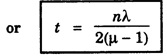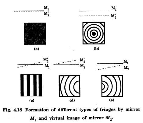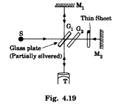 n = 0, 1, 2, ... Case 1: When M'2 coincides with M1 i.e., the paths are exactly equal, the path difference is only λ/2. Therefore, the field of view is perfectly dark as shown in fig 4.18(a). Case 2: M1 is moved either forward or backward parallel to itself. Now, mirror M1 is exactly perpendicular to mirror M2, i.e., mirror M1 and virtual mirror M'2 are parallel. When an air film of constant thickness is enclosed between mirrors M1 and M'2 we observe sufficiently spaced circular fringes as shown in fig. 4.18(b). Case 3: When mirror M1 intersects the virtual image M'2, the air film enclosed is wedge shaped, and straight line fringes are produced as shown in fig. 4.18(c). If virtual image M'2 lies just above the plane of mirror M1 and they are not perfectly parallel, the fringes produced are curved as shown in fig. 4.18(d). If the plane of mirror M1 lies above the plane of virtual image M'2 and they are not perfectly parallel, the fringes formed are slightly curved as shown in fig. 4.18(e). It is used to find (i) the wavelength of a given light source. (ii) the refractive index and thickness of a transparent material (iii) the resolution of wavelengths (iv) the standardisation of metre Using monochromatic light of unknown wavelength λ, Michelson's interferometer is adjusted for circular fringes. The position of mirror M1 is adjusted till a particular bright fringe coincides with the cross wire. Now, micrometer screw reading is noted. When mirror M1 is slowly moved, the number of fringes n that moved across the field view of the telescope is counted. This may be in the order of 20 or 30 fringes. Again micrometer screw reading is noted. The distance d moved by the mirror is given by the difference between initial and final micrometer screw readings. When mirror M1 is moved through a distance λ/2, the path difference changes by λ. The position of a particular bright fringe across the cross wire is replaced by the next bright fringe. For one fringe shift, the distance moved by the mirror M1 is λ/2 (half of the wavelength). Let mirror M1 move through distance d and the number of fringes that crosses the field of view be n. For the shift of n fringes, distance moved by mirror M1 = d = nλ/2 Knowing d and n, the wavelength of monochromatic light λ can be calculated. For this purpose, a thin film of refractive index μ is introduced in the path of one of the interfering beams (Fig. 4.19). If the thickness is t, then the path of the beam is increased by (μ - 1). Therefore, the path difference between the beams becomes 2 (μ - 1)t. Suppose due to this path difference, n fringes move across the field of view. Then, 2(μ - 1) t = nλ If μ, n and λ are known, thickness t can be calculated.Principle