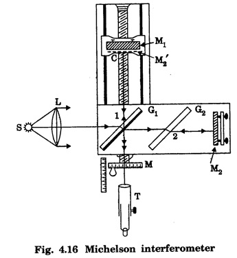 MICHELSON'S INTERFEROMETER Two interfering beams are formed by splitting the light from a source into two parts by partial reflection and refraction. These beams are sent in two perpendicular directions, and they are finally brought together after reflection from plane mirrors to produce interference fringes. Michelson interferometer is shown in fig 4.16. The apparatus consists of two highly polished plane mirrors M1 and M2. The mirrors are mounted vertically on two arms perpendicular to each other. The mirror M1 is mounted on a carriage C so that it can be moved forward and backward. The distance moved by this mirror can be accurately measured with the help of a graduated drum fitted on the micrometer screw M. The mirror M2 is fixed. There are two plane parallel glass plates, G1 and G2 of same thickness placed at an angle of 45° to the incident beam. The plate G2 is semi-silvered on its back side and acts as a beam splitter, i.e., a beam incident on it is partially reflected and partially transmitted. The plate G2 is a compensating glass plate. S is a monochromatic light source. A telescope (T) is positioned perpendicular to M1 to receive rays reflected from both M1 and M2. Light from source S is rendered parallel by means of a collimating lens L. This light is made to fall on a semi-silvered glass plate G1. The light beam is divided into two parts. One part of the light is reflected to travel towards mirror M1 (ray 1) while the other part of the light is transmitted towards M2 (ray 2). These light rays fall normally on mirrors M1 and M2 and are reflected back along its original paths. The light reflected by mirror M1 passes through G1 to reach the telescope T. The ray reflected by mirror M2, on reaching G1, gets reflected at its semi-silvered surface to reach the telescope. A path difference can be introduced between the two reflected rays by moving mirror M1. If we look through the telescope in the direction of mirror M1, we can see mirror M1 directly together with a virtual image of M2, denoted by M'2 formed close to M1 by reflection in the glass plate G1. Hence, the rays reaching the telescope appestr to travel from M1 and M'2. Thus, Michelson interferometer system is optically similar to the interference from an air film enclosed between M1 and M'2. The interference fringes may be straight, circular or parabolic etc., depending upon • path difference and • angle between mirror M1, and virtual mirror M'2. Function of the compensating plate G2 The ray reflected at M1 passes through glass plate G1 twice and reaches the telescope, while the ray reflected at M2 does not pass even once. That is why a second plate (G2) made with same material, thickness and inclination as G1 is introduced along the path of the ray travelling towards M2. Thus, the function of plate G2 is just to equalise the optical paths travelled by both rays. • One of the interfering beams comes from M1 and the other appears by reflection from the virtual image of mirror M2, i.e., M'2. •