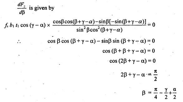 MODIFIED MERCHANT THEORY According to this theory, the relation between rake angle (α), shear angle (β) and friction angle (γ) is given by The following conclusions are made by Merchant 1. Shear will take place in the direction in which the energy required for shearing is minimum. 2. Shear stress is maximum at the shear plane and it remains constant. Since, the Merchant's model is based on the minimized rate of energy consumption which is equal to Fz × r. For optimum value of β, Differentiating the above equation Fz with respect to β and equating it to zero.