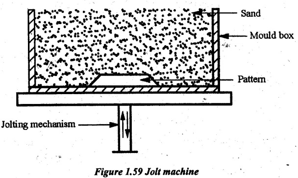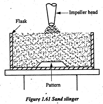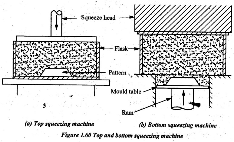 MOULDING MACHINES Moulding machine is used for mass production. Since the hand moulding is a slow process, it can be only used for making few castings. For producing more castings, moulding is done by using moulding machines. It reduces the labours and increases the quality of the mould. Moulding machines carry out the following operations: 1. Ramming the moulding sand 2. Rapping the pattern for easy removal 3. Removing the pattern from the sand The following types of moulding machines are generally used 1. Jolting machine. 2. Squeezing machine. 3. Sand slinger. Ingjolting machine, the pattern is placed in the flask / moulding box on the table. The flask is filled up with moulding sand. The table with moulding box is raised to 80 mm and suddenly dropped. The table will be operated pneumatically or hydraulically. The sudden dropping of table from a height makes the sand pack evenly around the pattern. This type of machine is mainly used for ramming horizontal surfaces on the mould. The operation is noisy because of jolting. In a squeezing machine, the moulding sand in the flask is squeezed between the machine table and a squeezer head. A top squeezer machine is shown in Figure 1.60 (a). The mould board is clamped on the table. The flask is placed on the mould board. The pattern is placed inside the flask. The sand is filled up and leveled. The table is raised by the table lift mechanism against the squeezer head. The platen enters the sand frame and packs the sand tightly. After squeezing the flask, the table comes down to the starting position. The main limitation of this machine is that the sand is rammed mould on the top of the mould than the sand near the pattern. Here, the pattern is placed on the mould table. The mould table clamped on the ram. The flask is placed on a frame and filled with sand. The table with the pattern is raised up against the squeezer head [refer Figure 1.60 (b)]. Thus, the flask with the pattern is squeezed between squeezer head and table. Then the table returns to its original position. Moulding process is performed by using a sand slinger as shown in Figure 1.61. In this process, the pattern is placed on a board. The flask is placed over it. Now, the slinger is operated. The slinger has an impeller which can be rotated with different speeds. When the impeller rotates, it throws a stream of sand at greater velocity into the flask. Hence, the sand is packed in the flask. The slinger can be moved to pack the sand uniformly around the pattern. The density of sand is controlled by the speed of the impeller. In this method, the roaming will be uniform with good strength. It is used for large and medium size moulds.1. Jolting Machine
