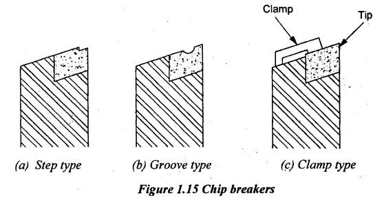 NEED AND TYPES OF CHIP BREAKERS During machining, long and continuous chips formed at high cutting speed will affect the machining process. It will spoil the tool, work and machine. These chips are hard, sharp, and hot. It will be difficult to remove the metal and also it is dangerous. Chip breakers are used to break the chips into small pieces for easy removal, safety and to prevent damaging the machine and work. It is very important to provide chip breakers in automatic machines and machines which are running at high speed. The various types of chip breakers provided on the cutting tool are shown in Figure 1.15. The different types of chip breakers used on a cutting tool are: (i) Step type (ii) Groove type and (iii) Clamp type In the step type, a step is ground on the tool face behind the cutting edge. This step will break the chip. In the groove type, a groove on the tool face behind the cutting edge will break the chip. In the clamp type, a thin chip breaker is clamped or screwed on the face of the tool.